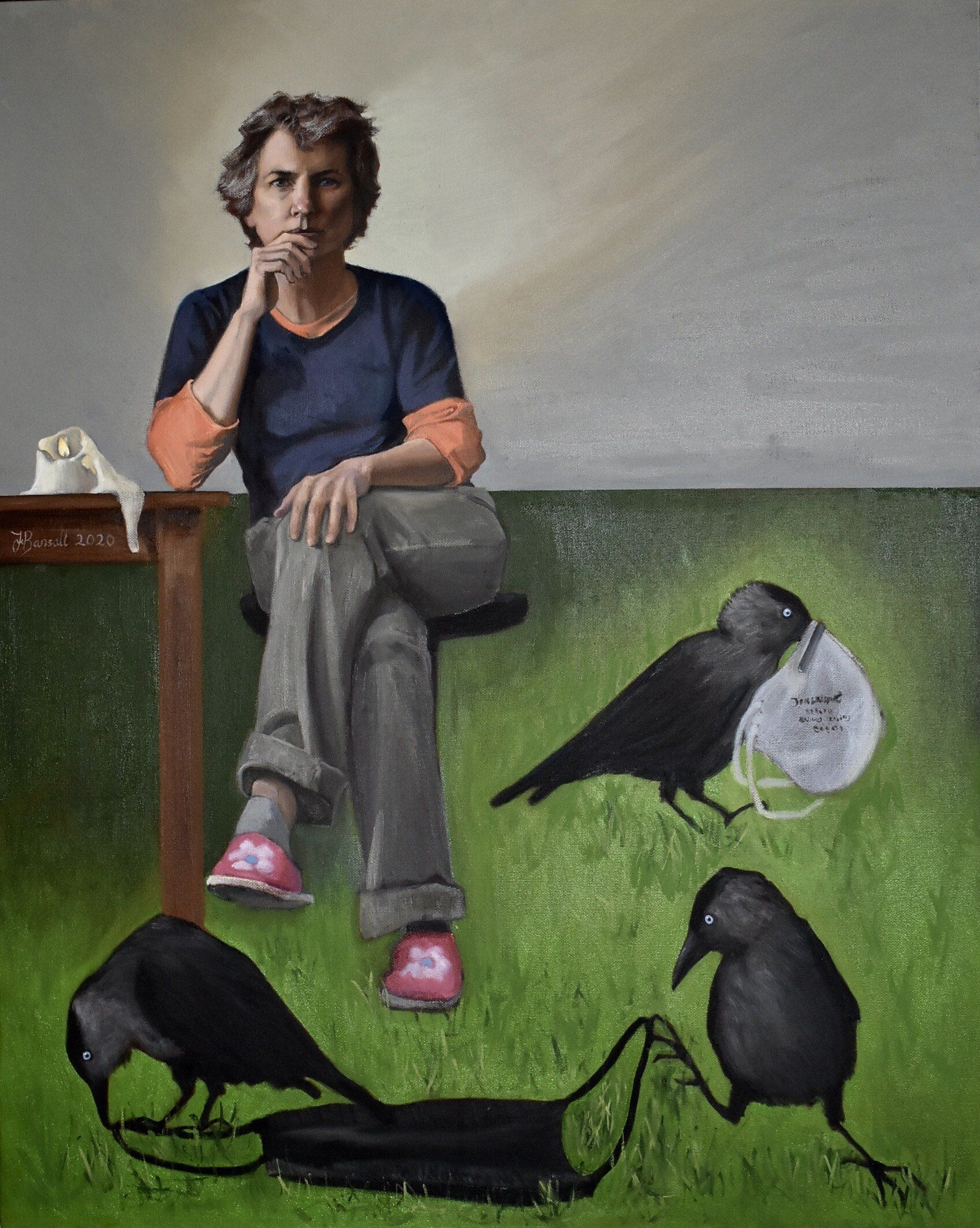 Jo Bansall, Thoughts 2020, Oil on canvas, h 76 cm x w 61 cm - My thoughts during COVID-19 in 2020, self portrait with jackdaws, masks and a burning candle.