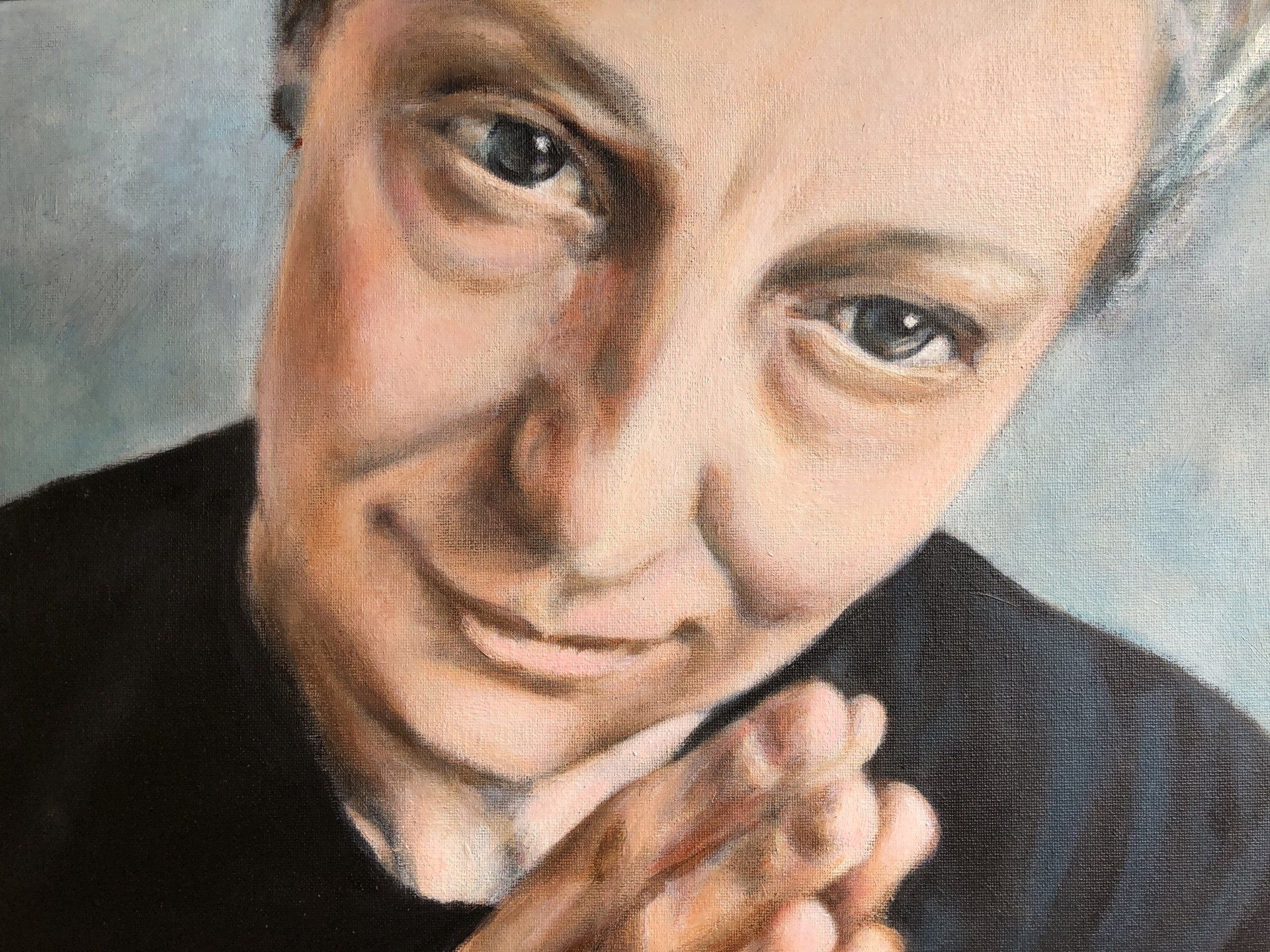 Claire Thorogood, Marianna - In these interesting times as an artist I have been inspired by all sorts of things. I really notice body language and I have particularly noticed it on zoom which we have all been forced into using in these covid unfriendly times. In one of my virtual tai chi sessions I particularly noticed the beauty of my Italian friend Mariana, who while self isolating with her parents in Italy managed to with her engaging, enquiring, curious presence, inspire me and lift my spirits.There was no doubt in my mind that I needed to capture her optimistic and uplifting presence on canvas. As a virtual student she offered so much to the class, and I hope I have captured the moment!