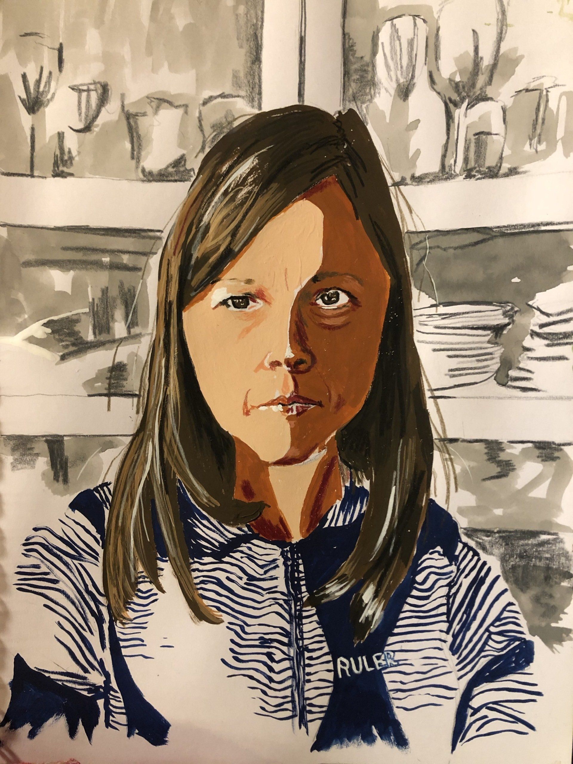 Harriet Merry, Harriet “Ruler of the Home” (self portrait during Lockdown #2) - Harriet, derived from the name Heimiric - heim means home and ric means ruler. I do currently rule the home but far too much for my liking and lockdown #2 has been a time of extreme moods. This was created using gouache and coloured pencil on paper.