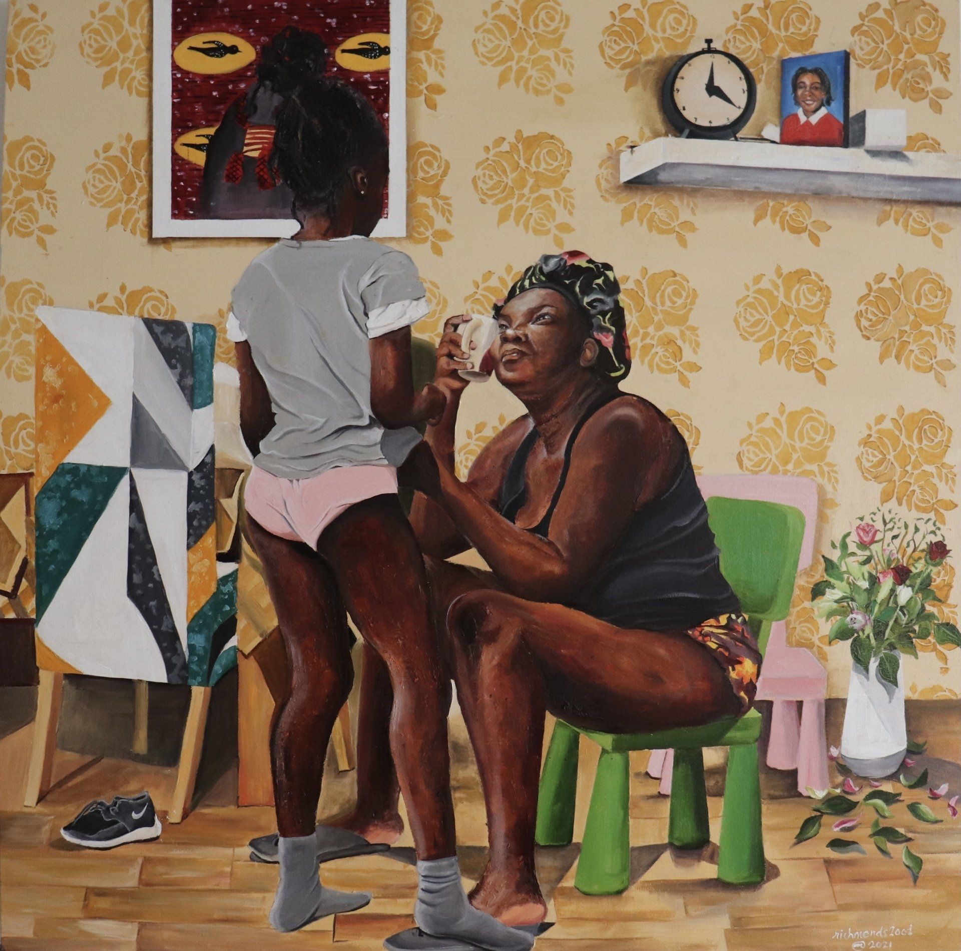 Richard Mensah, Dear Mom - Dear Mom is a third in my series of the ‘lockdown rebels’, a series of painting completed during the third national lockdown in UK during the COVID-19 pandemic. The series explores the challenges and how families have adapted and are coping with spending a greater part of the day at home especially with children requiring and wanting attention round the clock during the lockdown period. This 3rd instalment is about the daily negotiations, little chit chats between parents and kids and the constant time and attention required by children is captured.