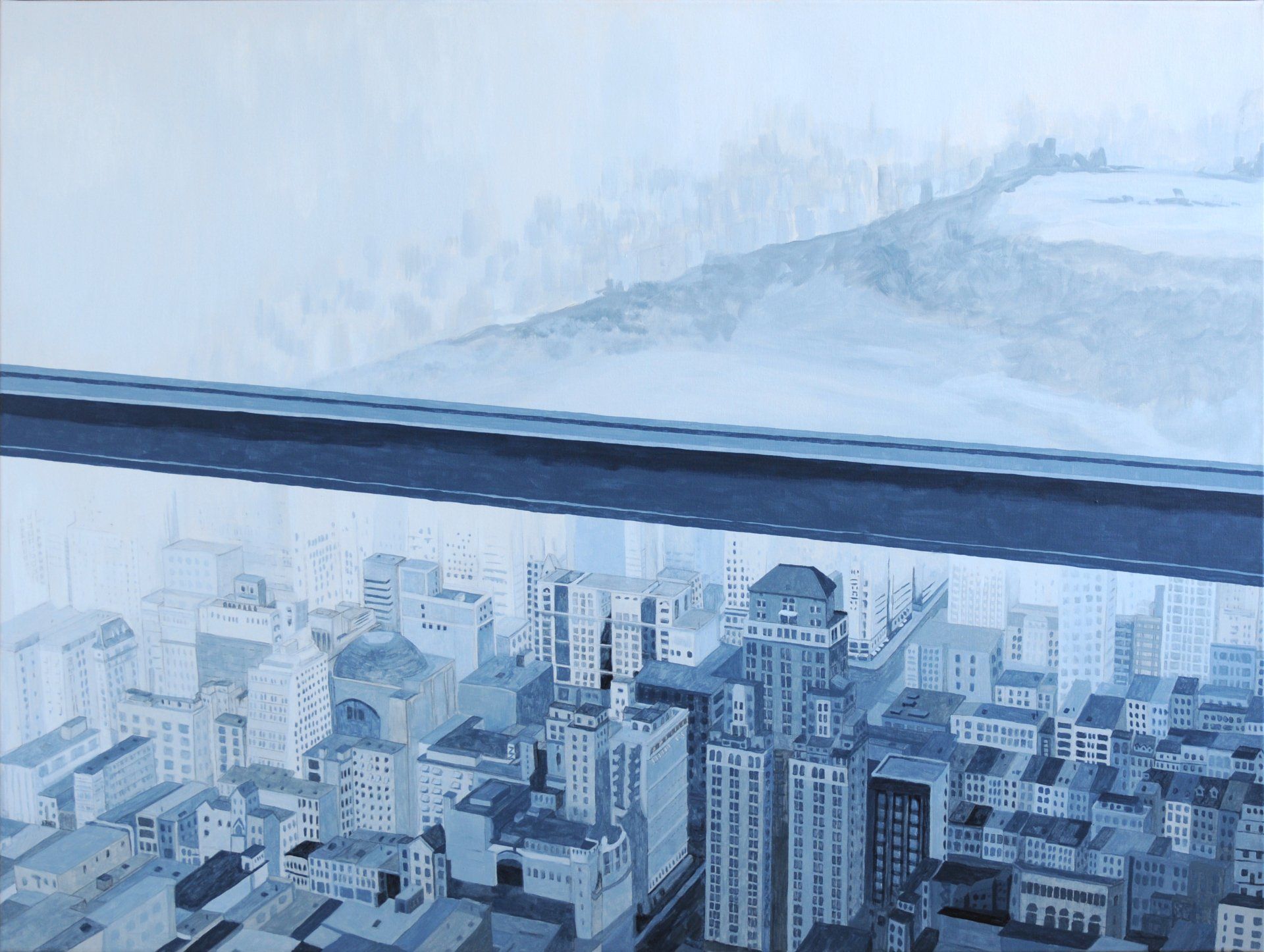 Carol Loeb, Lunch Atop a Skyscraper 2020 - The outbreak of COVID-19, which caused such massive disruption to human society, led Carol to investigate the formerly bustling but now quiet urban landscape closer to home. Her paintings are about living in the city during the pandemic - urban landscapes devoid of people. The places are familiar, the spaces are the same, yet somehow different. “Lunch atop a Skyscraper 2020”, a tongue-in-cheek painting inspired by the original 1932 Charles Clyde Ebbets photograph, creates a balance against the stark reality and stress of living under the pandemic. The original had eleven men eating lunch on a girder high above the city; Carol’s painting has them following stay-at-home orders. The monochromatic blue colour scheme emphasizes the melancholy atmosphere.