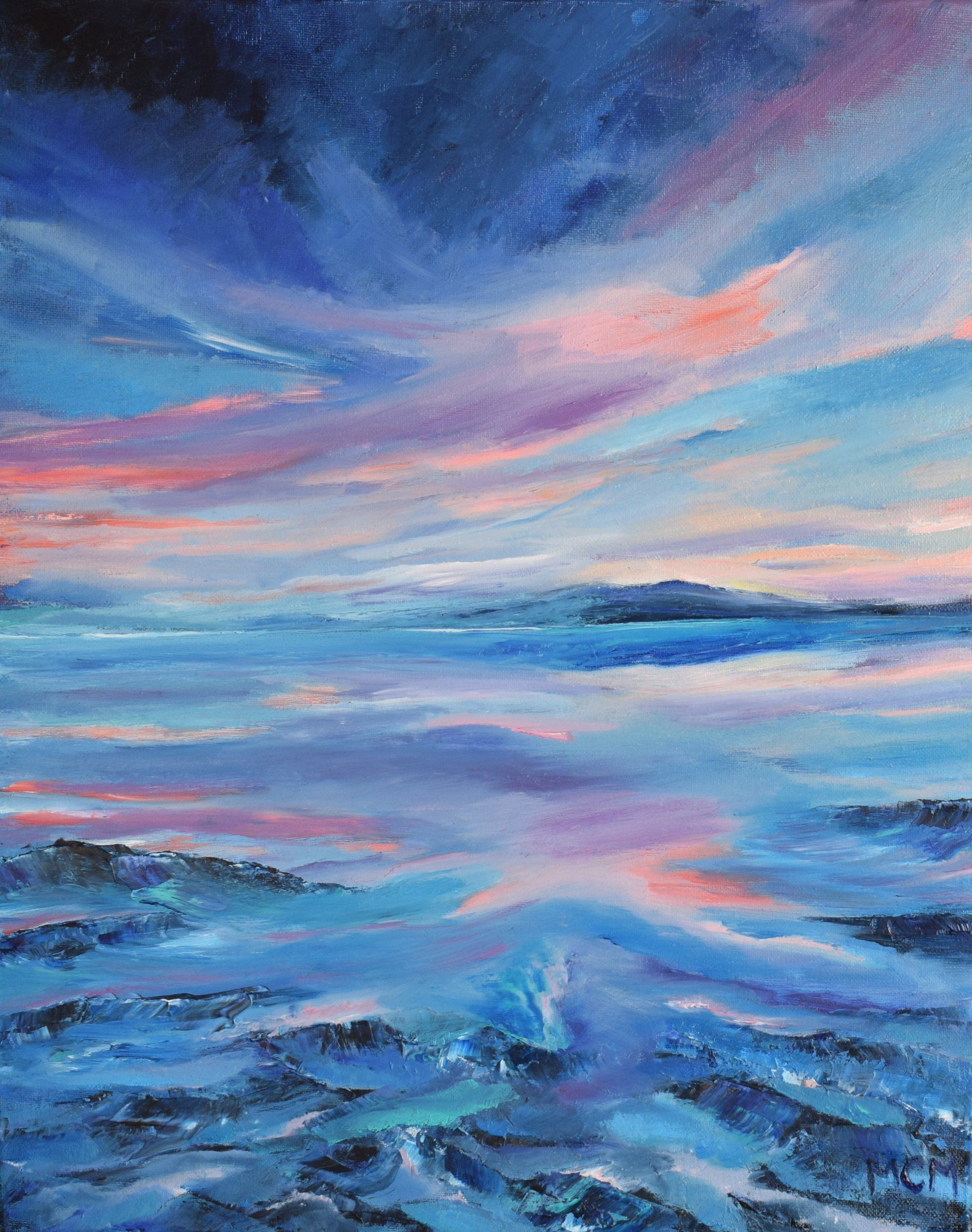 Mónica Casanegra, Reflections - My aim for this landscape painting was to bring light and hope in a time which we find ourselves in isolation during this global pandemic. With this in mind, “Reflections” is a spacious timelessness painting, where I can loose myself in fascination. Inspired in all the times where I could contemplate in stillness the sea and the sky for hours. The promise of the light ahead, and a changing sky colours, reflected on the gentle waves crushing on the rocks. Memories from moments as I waited for the sun to disappear below the horizon, giving me hope that tomorrow will be another day to observe and remember.