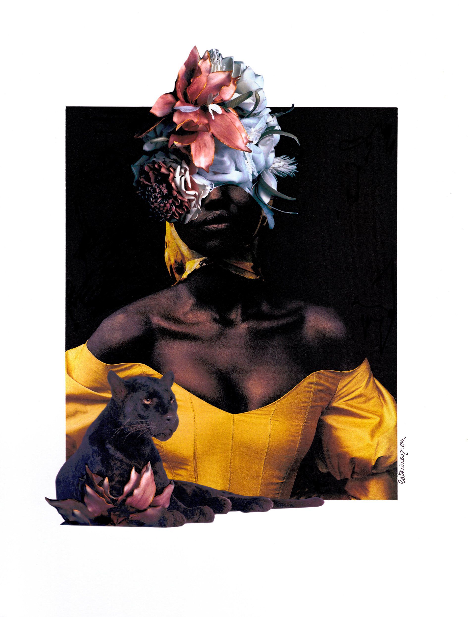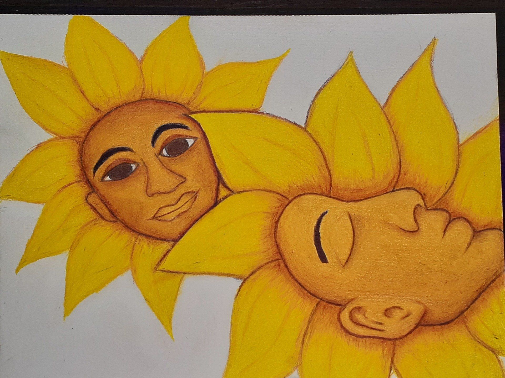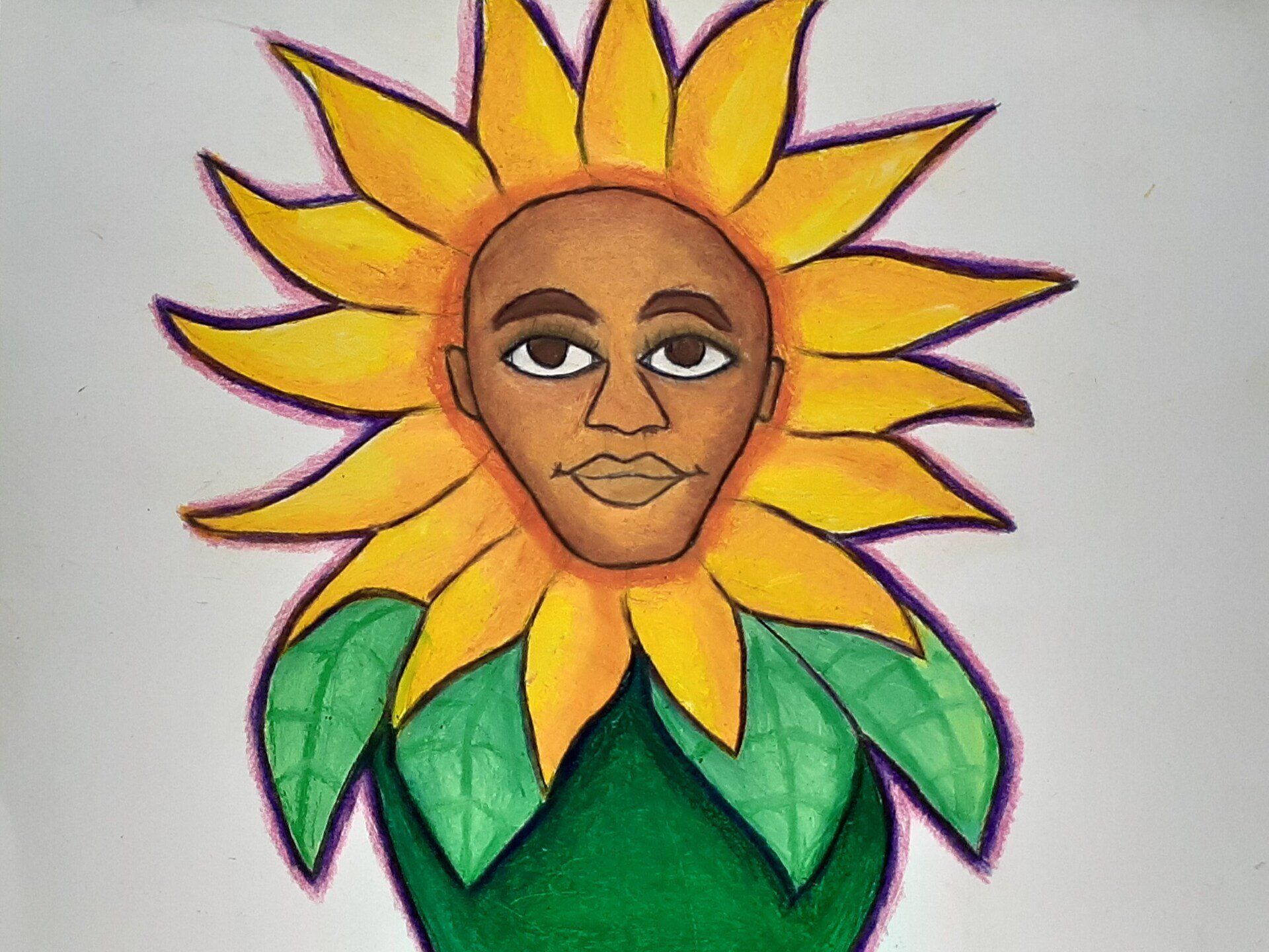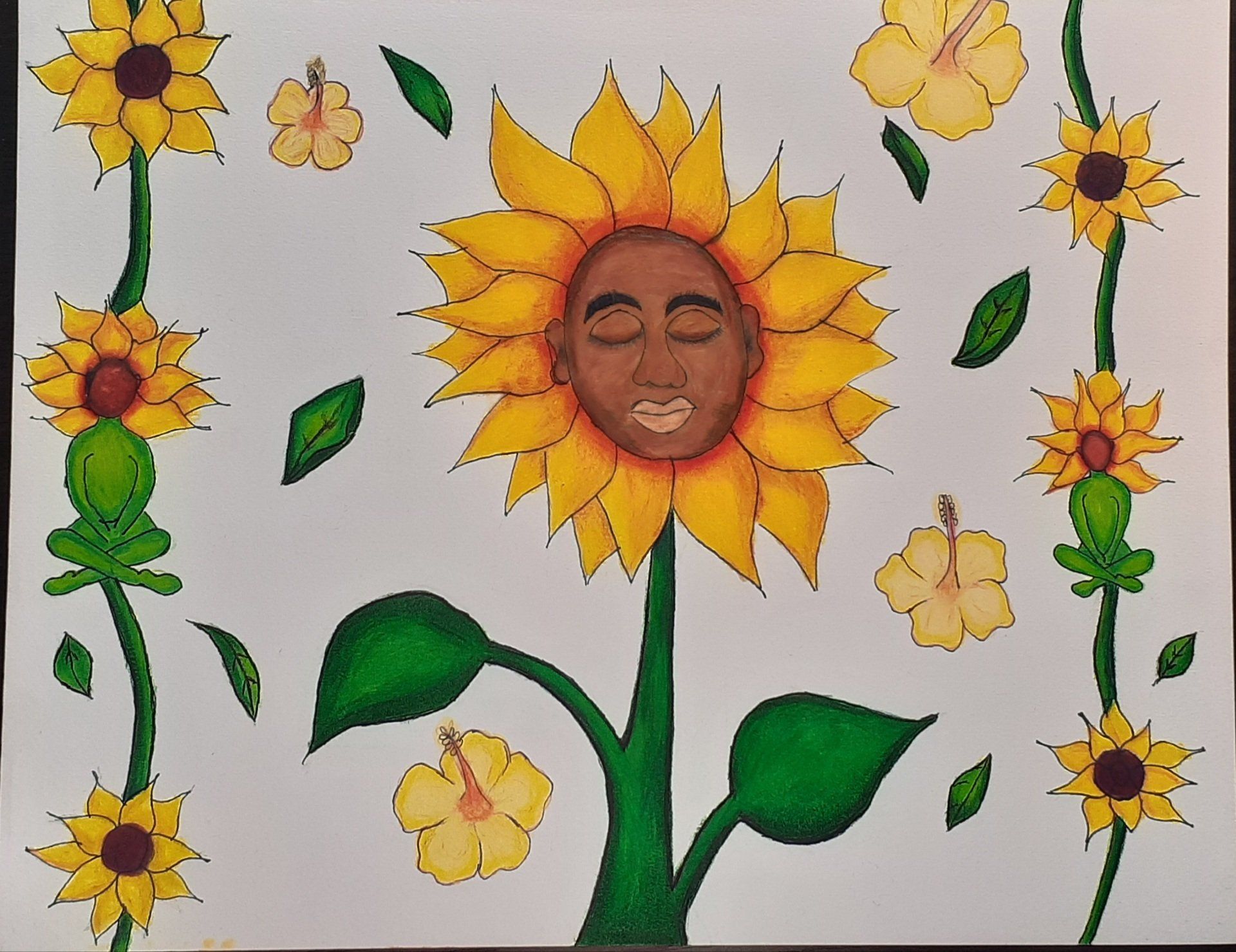 Icy Burson, HUMAN SUNFLOWERS - I actually started back drawing the year before COVID-19. It just happens that Covid give me more time to focus on my art work. It slowed everything down and made me take a look at what really important, and for me that happen to be my health. Around the time Covid-19 first surfaced, I was scheduled to have a wisdom tooth pulled. I was very skeptical about the prescription they gave me, so I began researching how to take care of myself. It shocked me how much natural herbs, chlorophyll, and many others made me realize how much we are connected to the earth and it’s natural resources. This made me appreciate nature and how it is here to help us. The Sumflowers were inspired by those on my boss’ desk at work. Upon seeing how tall and strikingly beautiful they were, it made me draw a parallel between plants and humanity, how they both go hand in hand due to the fact that they are both living organisms that require care and nurturing in order to grow.
