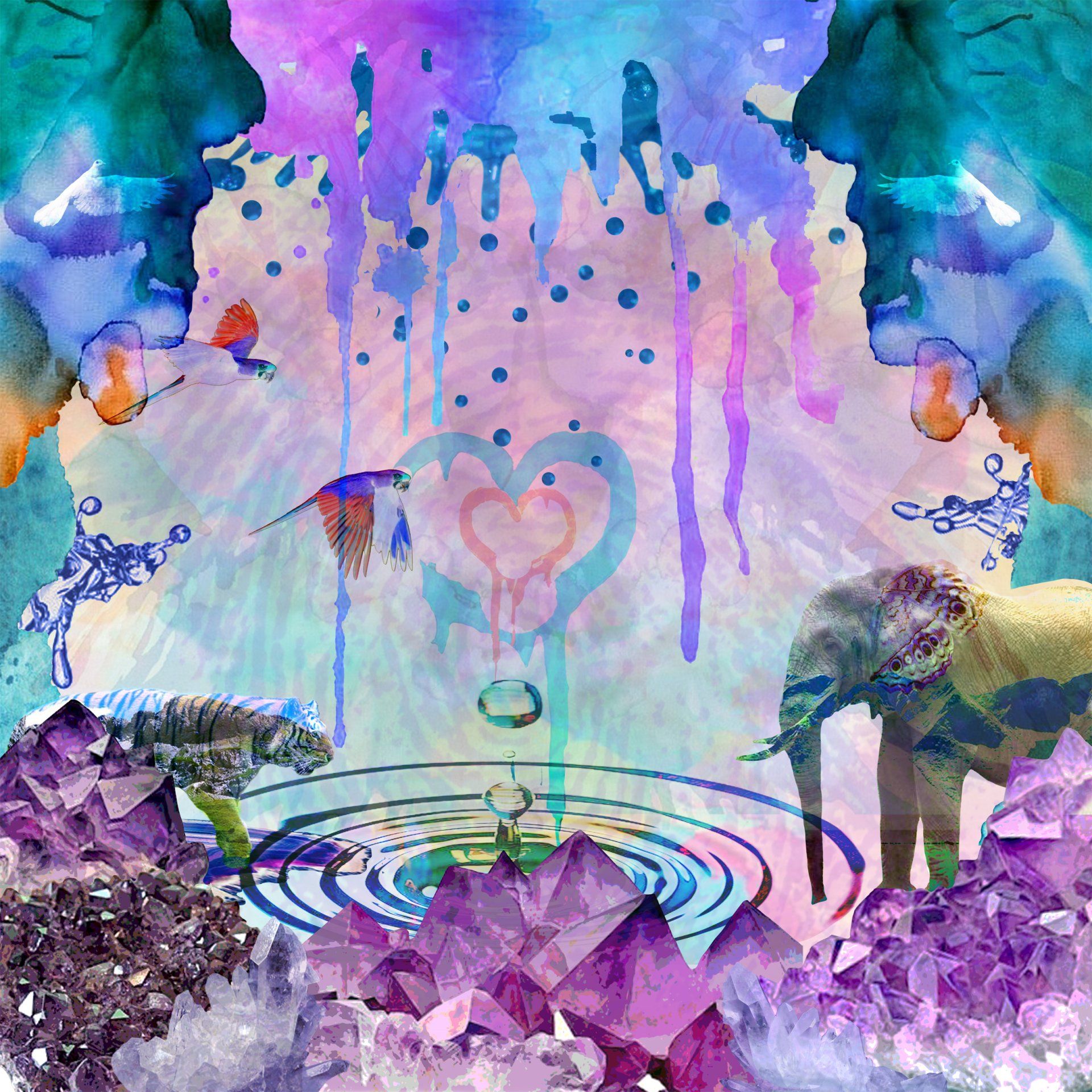 Benny Warsh, Watering Hole - The Watering Hole has underlying themes of hope, fragility, conflict and wonder. Early on in the COVID-19 pandemic confusion, fear and the unknown sunk in for all prompting revaluation and overall gratitude. The composition contains elements speaking to fleeting time, absolute stillness, and opposition. The meeting between tiger and elephant at the watering hole is representative of differing opinions regarding courses of action while gathering around what is essential. The movement of colour and flight embodies our desires for interaction fleeting or dripping away while precious stones ground us all in place. Two hearts play in the center of the piece calling for calm while the human condition is marked on the scene with the artists thumbprint.