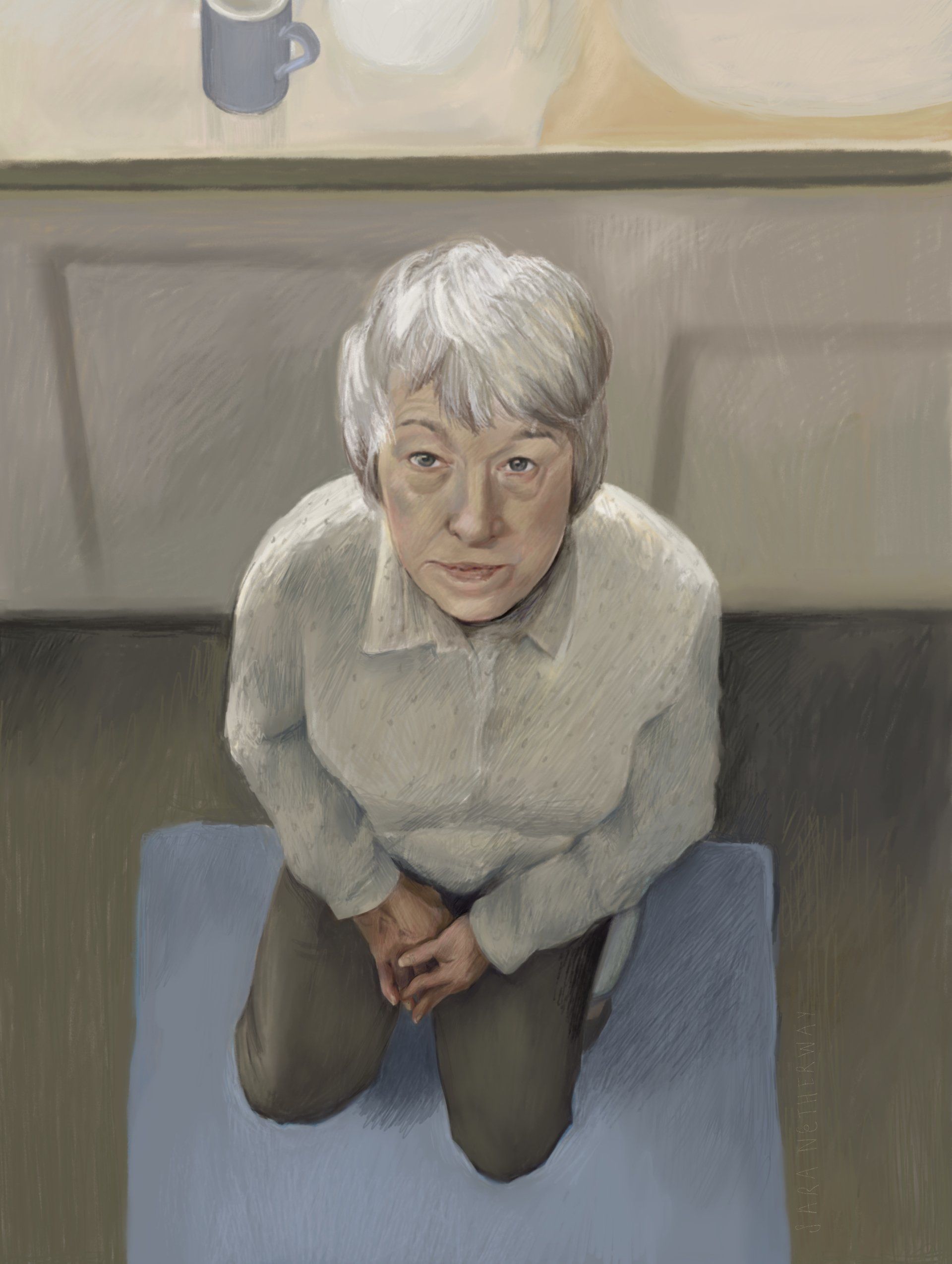 Sara Netherway, GRANDMA - The piece is about the loneliness and isolation that older people feel during lockdown in England during the pandemic. Particularly those who are sheltering because of their age and already compromised health. The image is looking down from above giving a sense of isolation, with the pallet giving a sense of loneliness and the single mug on the kitchen worktop.