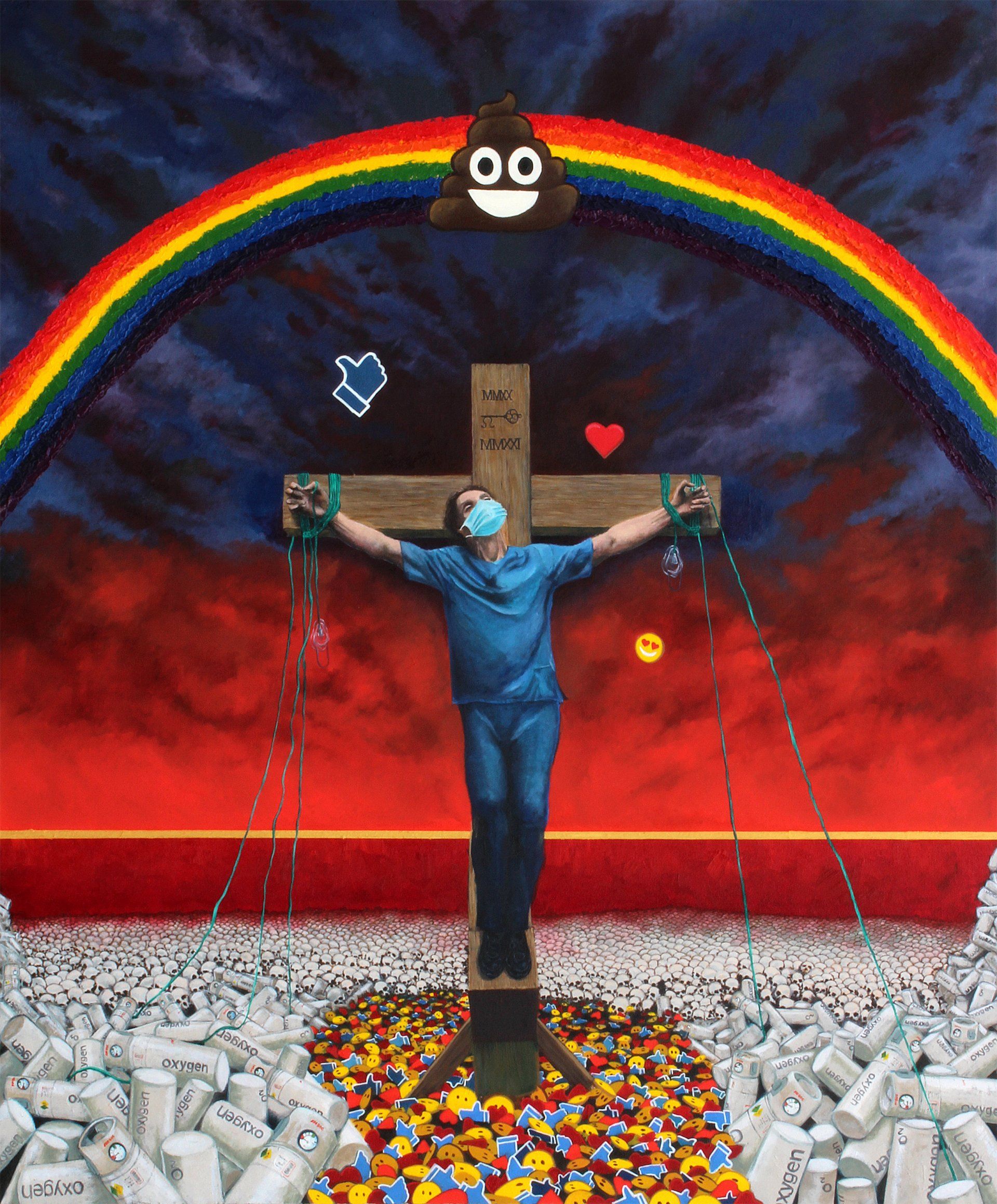 David Nicol, Running on Empty - As a nurse I was sent to work on the covid ward in October 2020. By November I had contracted covid. I was lucky in that I had a mild case, but colleagues and friends did die. I was compelled to create this tribute to our keyworkers and to express and process my experiences through that work. With empty oxygen cylinders and discarded emojis littering the foreground, a keyworker is crucified, held in place by oxygen tubing. Above, a crudely rendered rainbow crowned with a poo emoji showers the keyworker with likes and hearts. The inscription on the cross reads MMXX – MMXXI above and below a key, the wards in the shape of Omega to symbolise every keyworker affected.