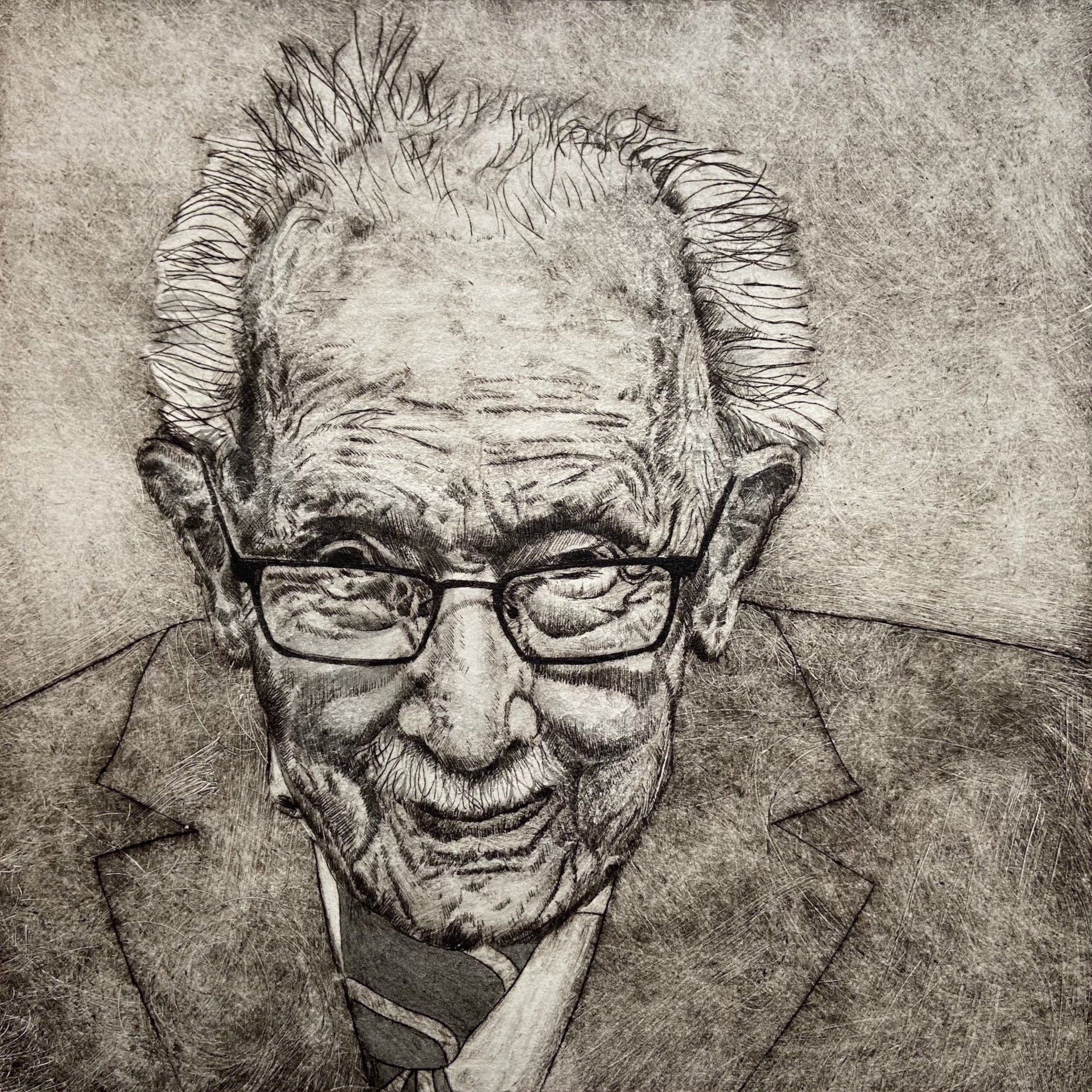 Faith Chevannes, Captain Sir Tom - Everyone loves Captain Tom. He became a symbol of hope during COVID-19 and the nations hero. We were all scared, but he was so calm and positive he made us feel ok. At the age of 100 he raised an eye watering minimum of £32 million pounds, broke world records and was knighted. I wanted to make a drypoint etching of him because the process creates beautiful velvety burr lines which highlight the beauty of his kind features. I started making portraits for the first time with Sky Arts portrait artist of the week during lockdown one. I began to find my happy place using drypoint etching and won in October 2020 with my portrait of Annie Mac.