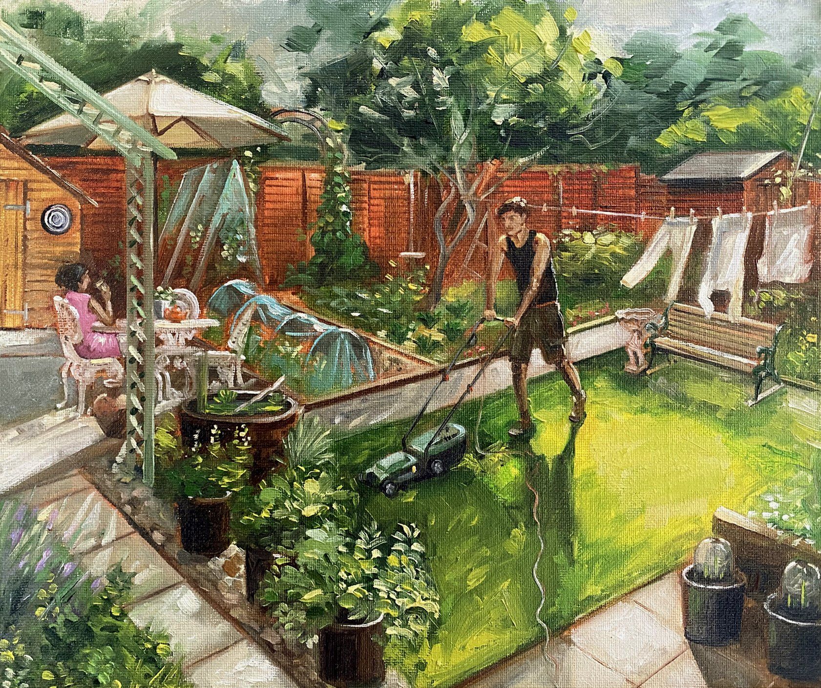 Tushar Sabale, Lockdown Gardener - During the Covid-19 Lockdown, many of us discovered the hidden passions and rekindled their hobbies. Some started knitting, some baking while others got into fitness. With my fondness for growing things, lockdown offered me enough time to look after my garden and manage to grow and harvest vegetables and helped us to avoid the long queues to the supermarket. I soon realized I wasn’t the only one who was growing things. The social media was full of posts by people learning to grow and plant something for the first time in their life. I think the gardens throughout the world never looked any better as they did during the lockdown. I decided to document this as another lockdown memory and paint my regular day in the lockdown garden. Seen here in the painting is me mowing the law while my wife having a cup of tea after watering her flowering beds.