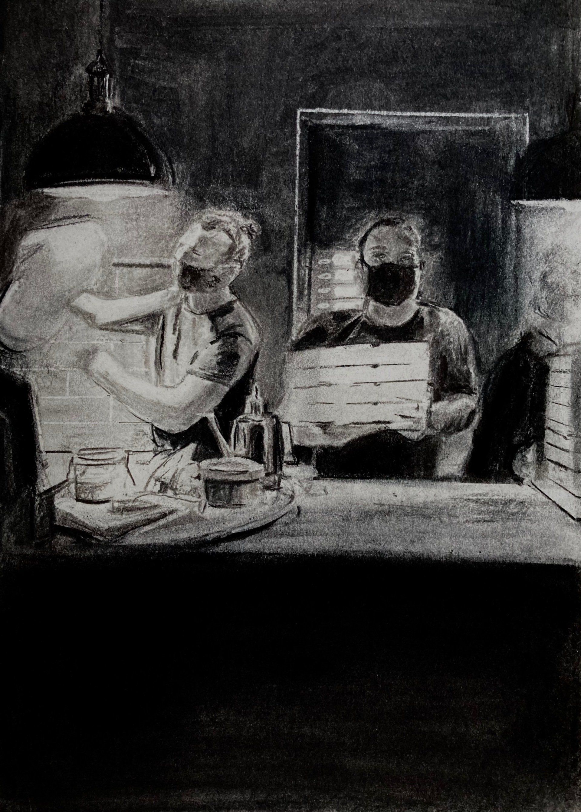 Philippa Clarke, Quotidian (Pizza night @ the Bucks Head) - Quotidian is a series of charcoal drawings on paper. The series is on-going and to date there are 150 drawings. During lockdown, unable to access my studio to paint, I began drawing to help feel in control when everything was dramatically out-of-control and unknown. The act of drawing was a way of slowing down, taking notice and recording everyday and otherworldly aspects of Covid-19. I posted each drawing on social-media, talking about personal experiences with a wider community. As time progressed, certain themes insisted themselves: the importance of outside space for exercise and escape; the role of technology in work, play and social lives; family and domestic life; community and key workers. Covid-19 continues to affect all segments of society but experiences of it are not universal.