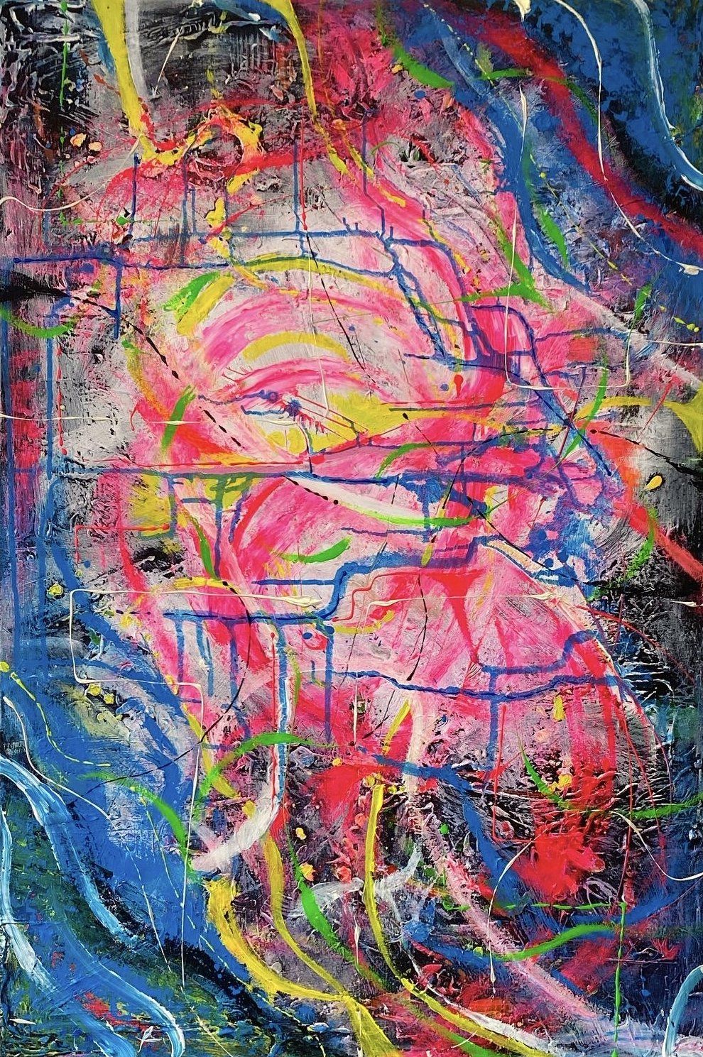 Kohlben Vodden, Orange Ebby - COVID-19 changed our world, made us ill, and even rewired our brains. The uncertainty, caused by isolating lockdowns and no cure, engages our brains threat response which means anxiety reigns and negatively changes our brains. ‘Orange Ebby’ was inspired by Neuroaesthetics – a field of psychology that seeks to understand how the brain perceives, and is rewarded by, beauty. Designed to be an experiment in engineering pleasure to counter the negative psychological effects of COVID-19, Vodden abstracts the human face to geometric shapes and reconstructs it into a beautiful expressionist depiction of the subject. This bold abstractionist portrait is psychologically engineered to stimulate reward pathways in the brain, in turn releasing dopamine a mood enhancing chemical associated with sex and love, – a temporary reprieve from COVID-19.