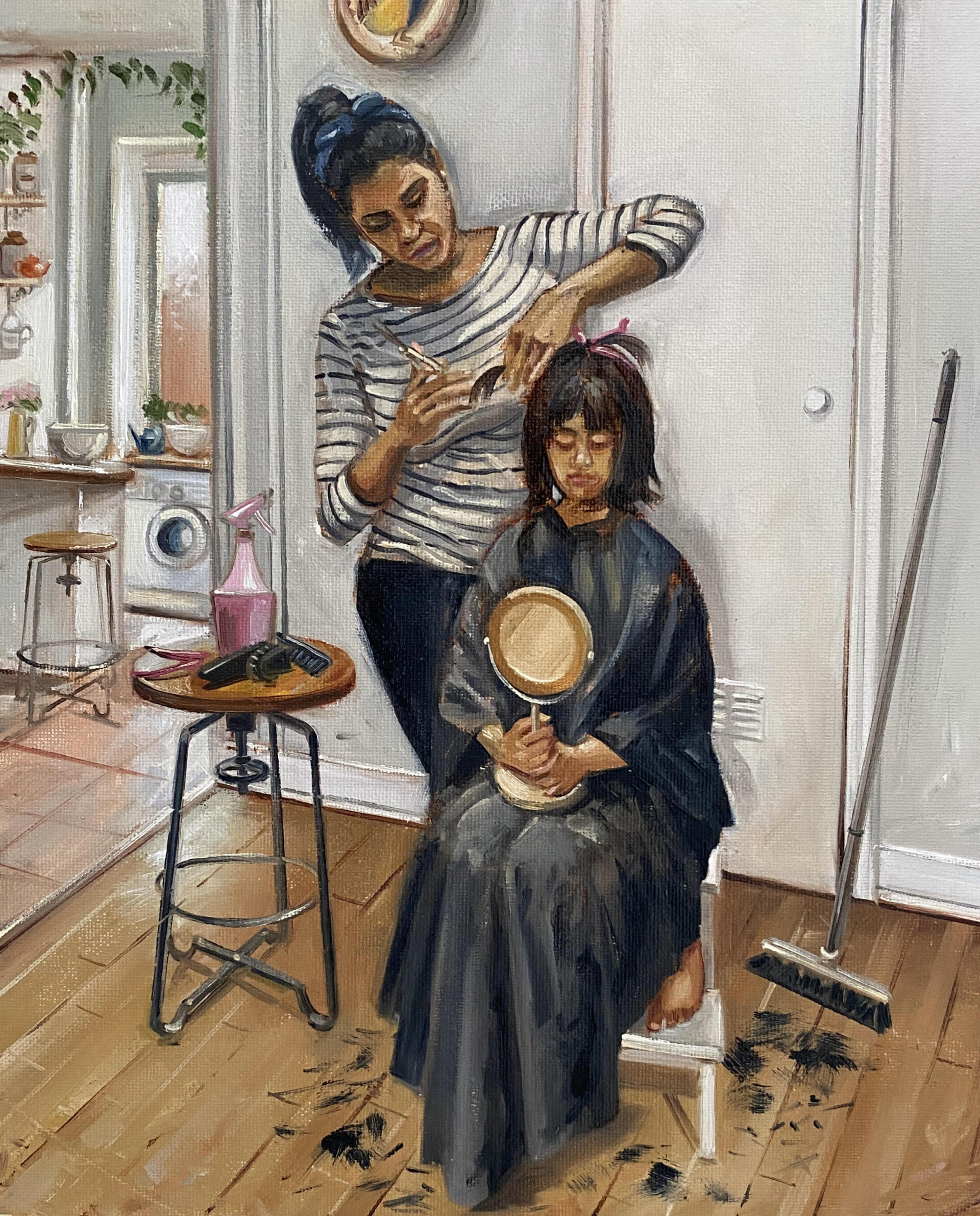 Tushar Sabale, Lockdown Hairdresser - UK officially went into lockdown on 23rd March 2020. Lockdown has been very challenging for so many of us at many different levels. While some struggled to keep up with the new normal, others struggled to even do the basic household chores. Learning basic survival skills has been the highlight of the lockdown. With all the basic shops and salon closed, Ruchi my wife, like in many households, turned into a family hair dresser for all of us. I documented many such occurrences of lockdown in my paintings. Seen here is my wife with my younger daughter who clearly is not very happy to get yet another trim at home.