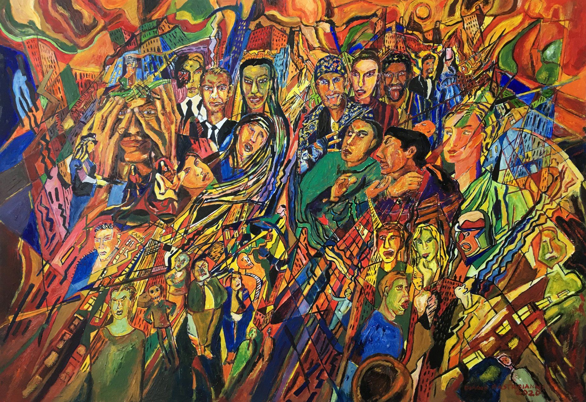 Biagio Mastroianni, This is the world - the admiration of false myth and folk tale - This is the world in our present time: leading by greed, avidity, horniness, glamour, fighting spirit and adoration of false myth and folk’s tale. The figurative expressive grimaces with anger, rage, disbelief, scepticism, admiration and hate, characterized by hard, fixed gaze and it accompanies combative gesture. Orange and red are the dominant colours. This highly pessimistic interpretation of our present time of a big city, stressing the alienation of man as he plunges headlong towards self-destruction. The transformation of the city from an apocalyptic vision in to a more optimistic perspective: well-being and pleasure find expression in smiling, serenity and tranquillity.