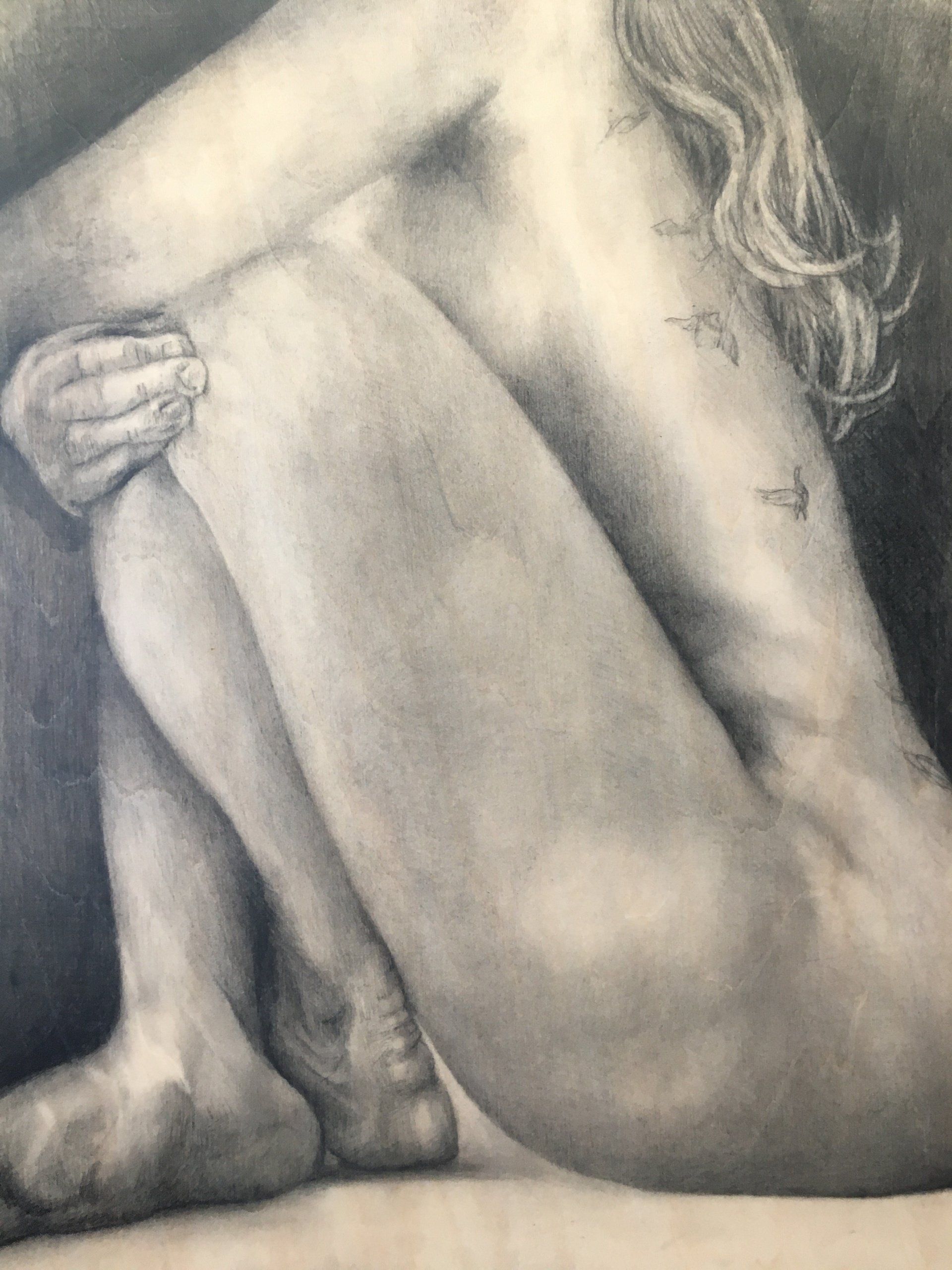 Shelby K Cook, Old Growth - This piece is exploring my own love of forests and an aspect of the relationship between humans and nature. A fading self-portrait blends in with the trunk of an old tree, showing my personal connection with trees as well as acting as a metaphor for the human race as a whole, showing that we are a part of nature, despite the often contentious relationship that humans have with the environment.