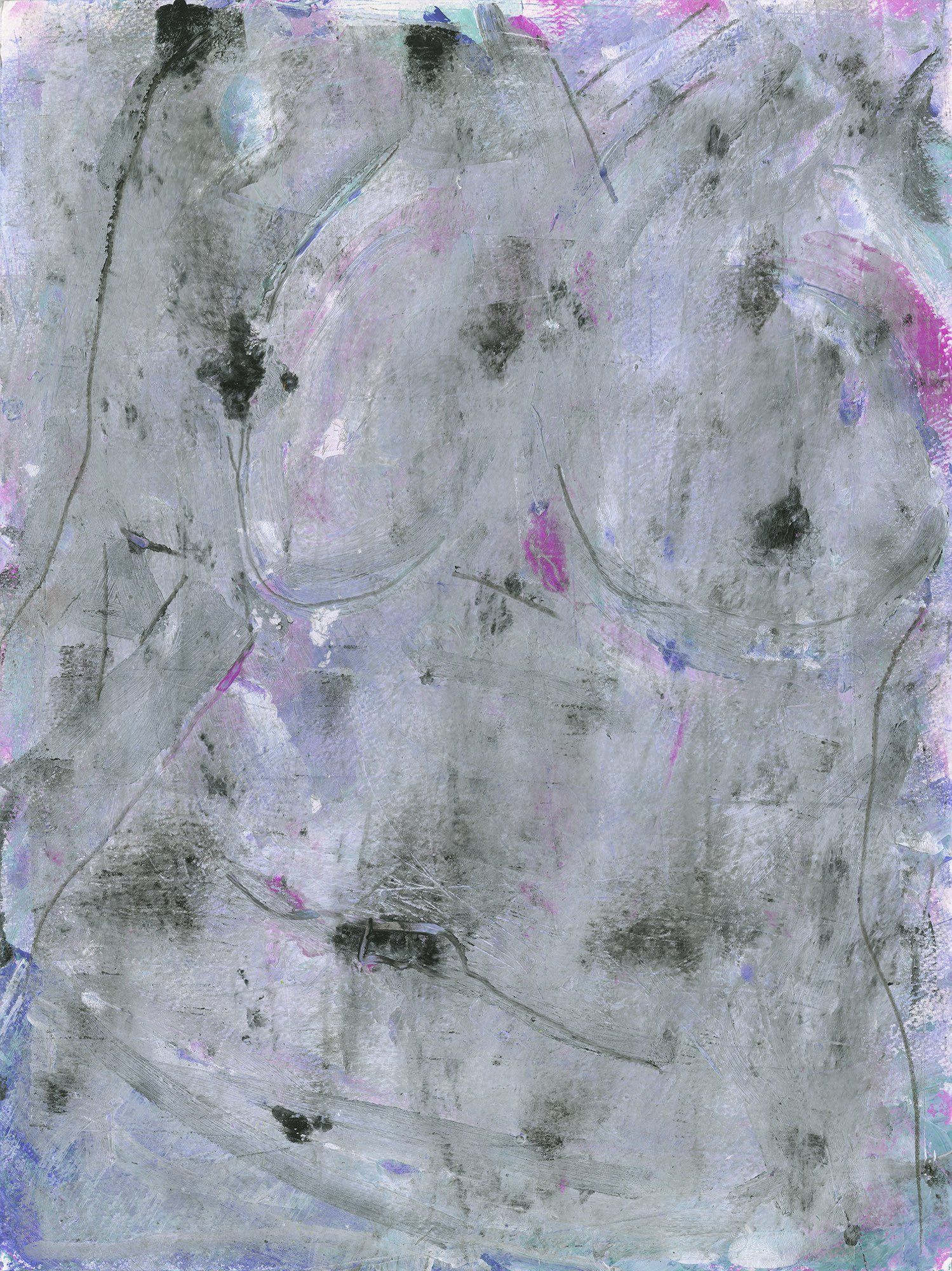 Geraldine Leahy, Mutation - Currently, I am looking at the effects of coastal erosion in my locality. My approach involves using debris, such as plastic, in layered processes that reflect changes in the environment. Mutation began as a monoprint of plastic strands found on the beach. I explore the incongruity of this manmade material which can create quite beautiful images in monoprinted form, yet is deadly to marine life. In Mutation, the plastic, which originally created an attractive composition on the canvas board, has changed into something more sinister with the addition of layers of paint and gouache. Areas of paint have been washed away, which references erosive activity.