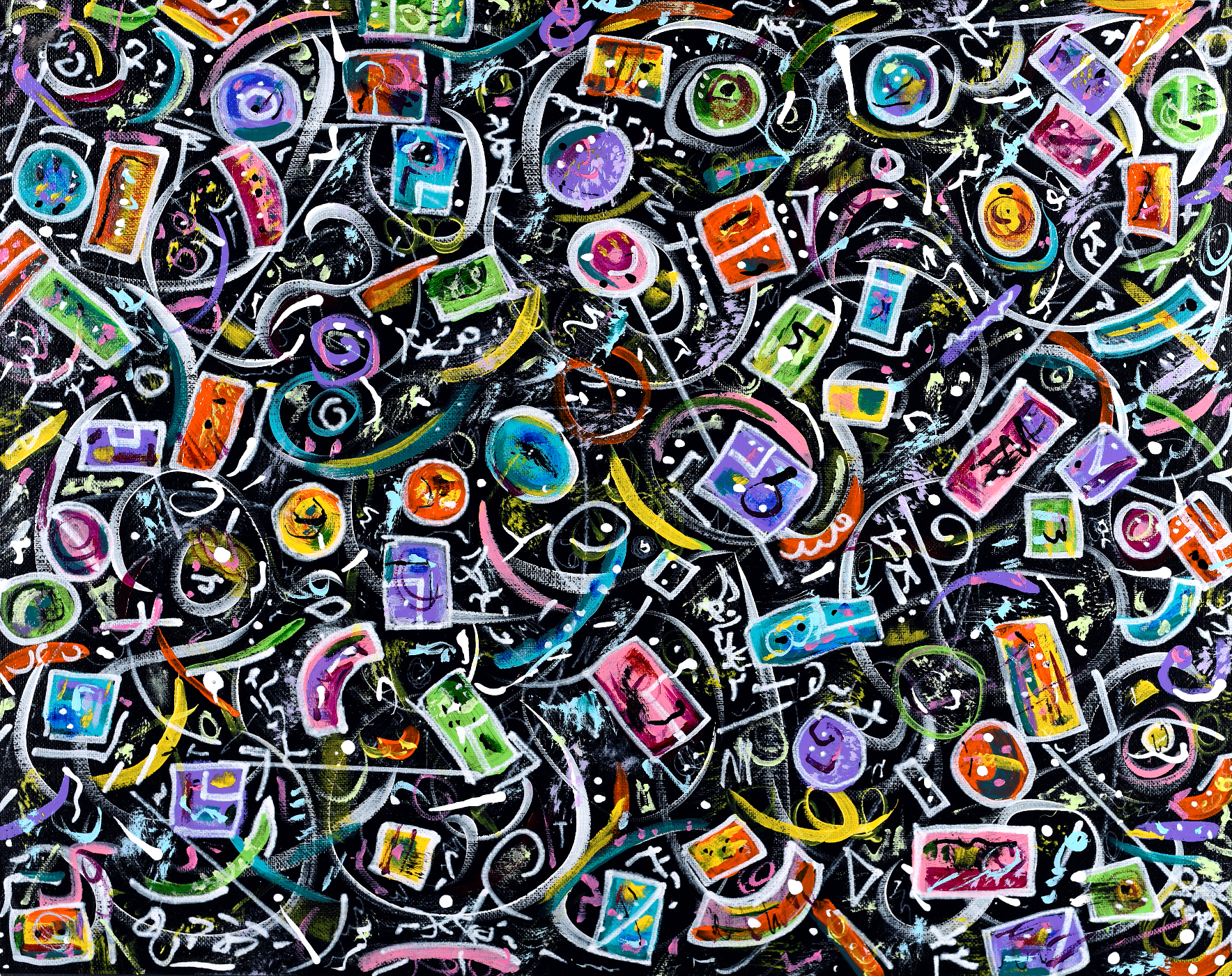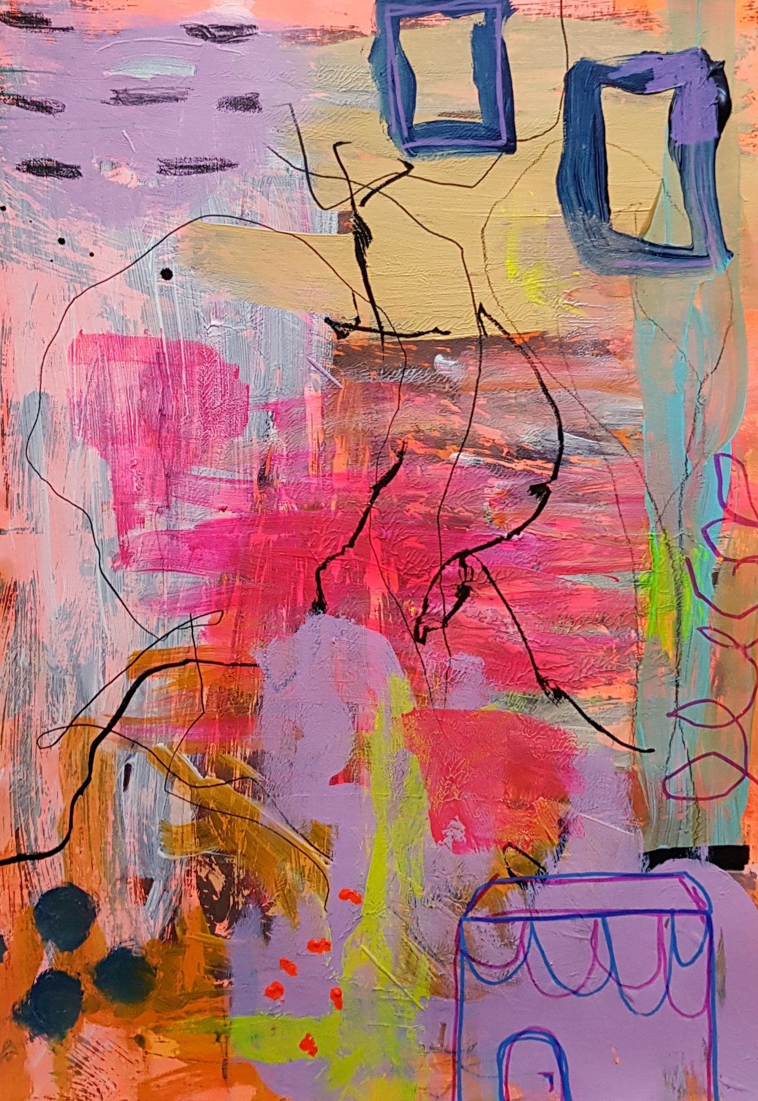 Jim Bertolacini, Just Give Me Some Candy - I paint abstracts almost exclusively because I love the feeling of spontaneous creativity, where I can produce something interesting and imaginative in the moment. I just allow my mood and internal thoughts to develop the imagery as I go. I use abundant color, random brushstrokes, and quirky shapes in my artwork. This piece is a good example of my style, a simple background filled with whimsical shapes highlighted by lively layers of paint and ink.