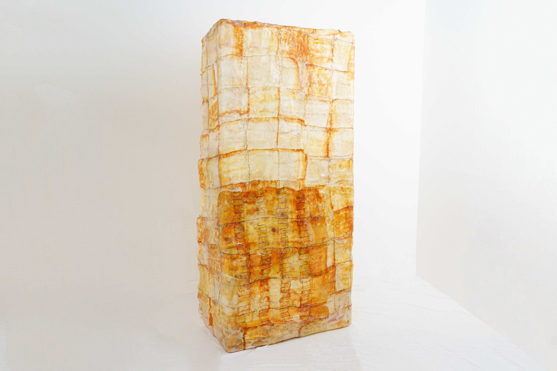 Yiju, Paar - Is a work made of gauze. Here gauze cloth soaked in iodine is standing on its own since it was hardened with glass fiber. Iodine solution that is commonly used as a disinfectant, is a metaphor for blood. Gauze works as a substitute for the skin when covering the wounded skin. Our skin is fragile and constantly exposed to the outside world, wounded and recovers, and continues to be replaced by new cells. Here, the gauze becomes the skin and the wound itself by holding the iodine solution. The glass fiber is placed on gauze fabric and melted, making it harder and allowing it to stand on its own as if it had an exoskeleton. The wound becomes a skeleton, and the wound becomes a body.