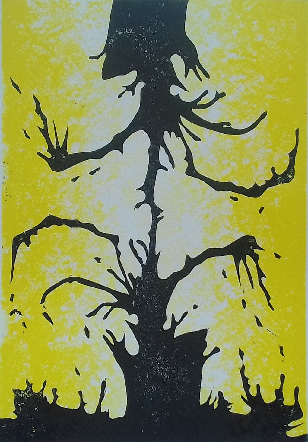 Jenny Longshaw, The Thread - ‘The Thread’ refers to a state of mind, when you feel ready to snap, an extreme buzz of energy, at the end of your tether…hanging by a thread. Yellow and black reflect this: a warning sign, a confrontation. This limited edition linocut print was using two blocks - the yellow / white gradient background and black for the main image. For this layer I arranged Indian ink splashes into the form, then traced and transferred to the lino block for cutting. Each print is hand burnished, this adds to the unique texture in the final image.