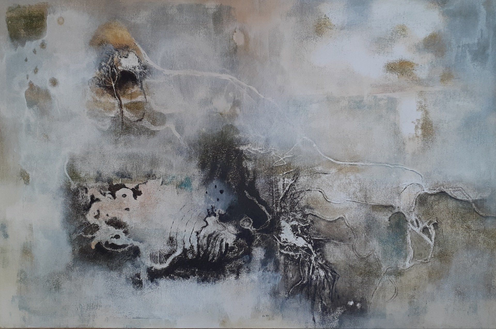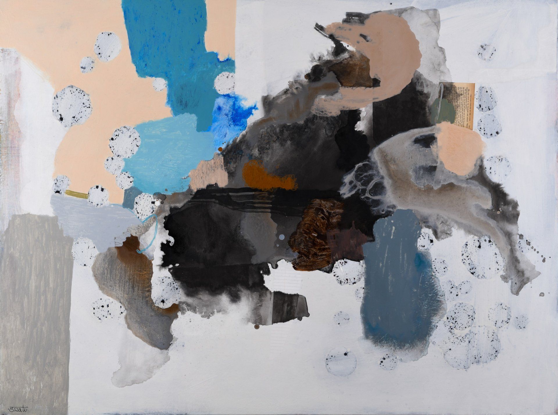 Swati Singh, A Spot in Time - A Spot in Time is an abstract expressionist work in acrylic and mixed-media exploring the vastness of nature and our minisculity in front of it. Walking along a beach we see the marks we momentarily leave behind on the sand as the next wave washes it away. Did it merge with the sea, or was the mark never there to begin with but just an illusion? Using the interplay of bright and dark areas, this painting illustrates our struggles with these ideas: the idea of our existence and the simultaneous absence of it, as if we were there, but not there at the same time.
