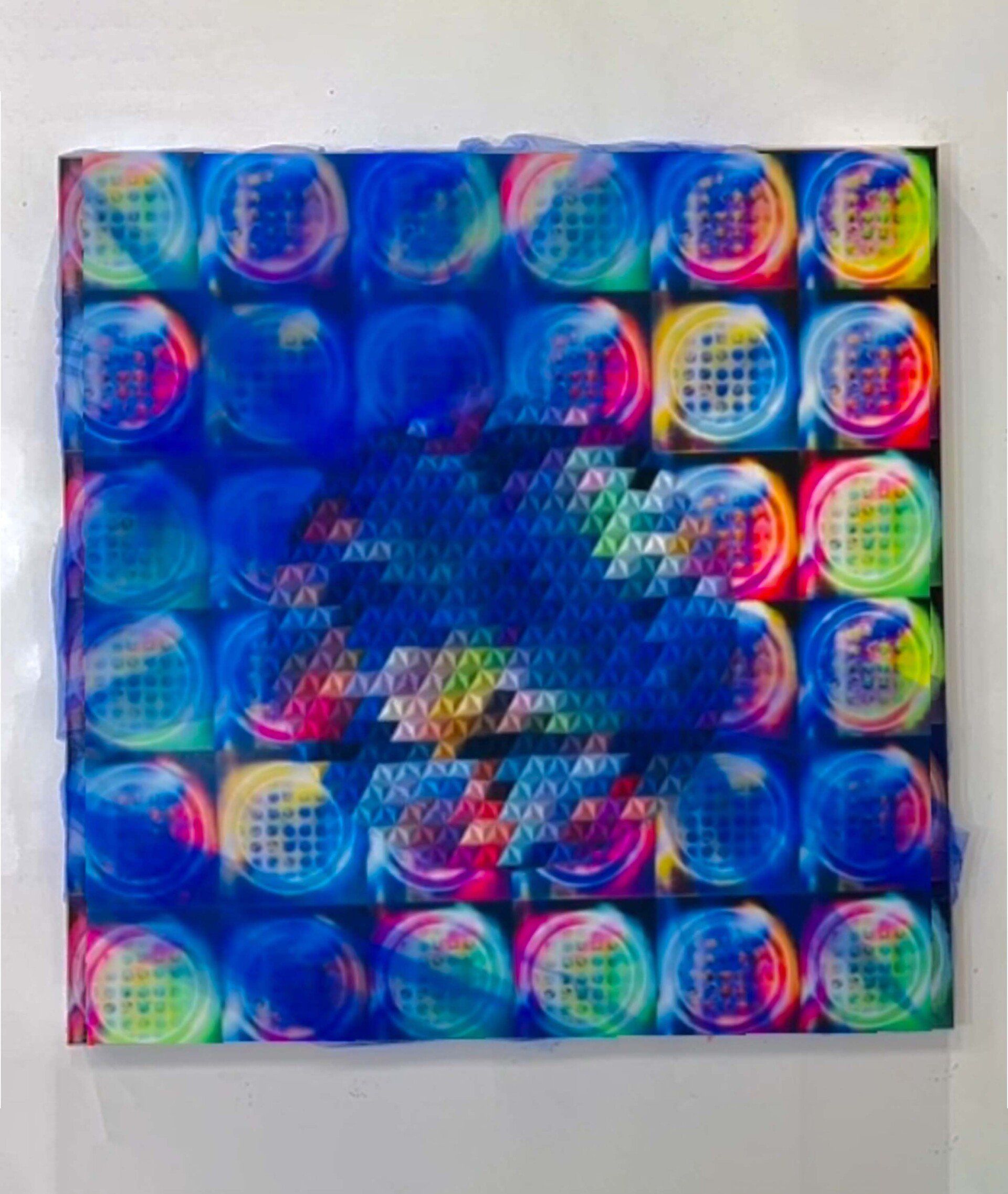 Masa Hayami, Simply breathe - It’ mixture of digital, digital printed and physical work and also created Argumented reality, finished with AR.Digital: Emoji,digital AI bot Luca, daily photograph, emoji, kimono, flat drawing of shrine. Physical: canvas,hand finished with transparent fabrics.