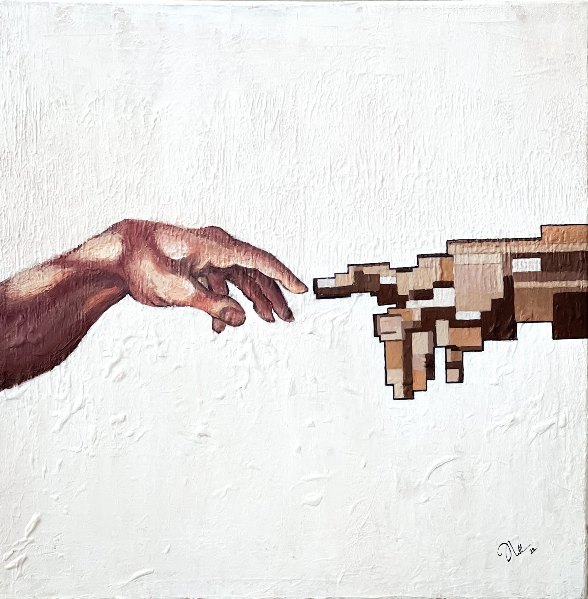 Nahla Al Shaikh, Michelangelo vs. Crypto punk, 50x50 CM and medium: Acrylic on canvas - “Michelangelo vs. Crypto punk” is an incarnation of the significant jump between the past and the current. the emergence of the digital and crypto art movements and their effect on our generation. it’s classic vs. Contemporary, renaissance vs. technology. It’s a reflection of Michelangelo’s ability to install a sense of awe in viewers of his masterpiece “ Adam creation” vs. Matt Hall and John Watkinson (founders of crypto punks) creation of revolutionary conceptual characters. And for this & beyond it was “Michelangelo vs crypto punk”