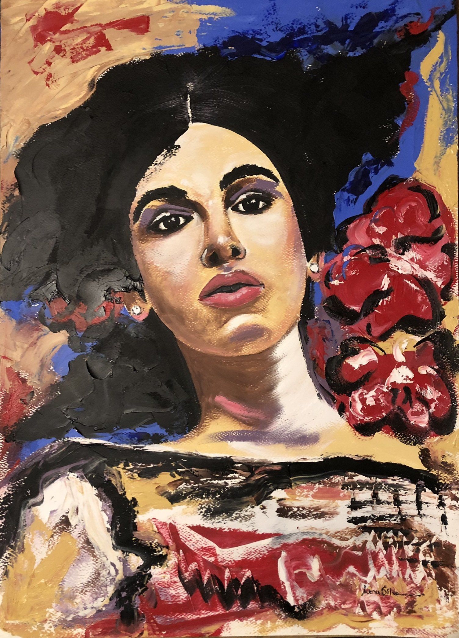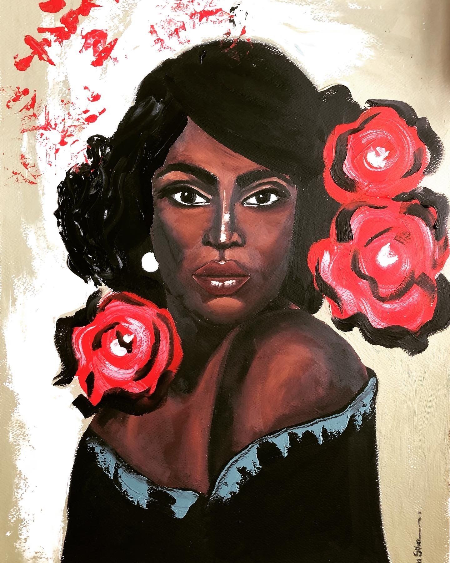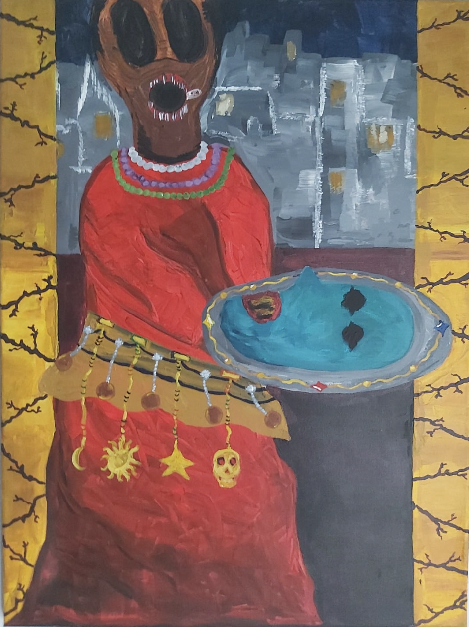 Gladys Abrahante, Ms. Wilson - This piece was inspired by myself. In general, the perception we have of people is not always accurate. Ms. Wilson represents a woman of power, confidence, beauty, and manipulation at times, but deep inside she is broken with sadness, pain, and suicidal ideation. Even though her wounds are hidden, she masks herself, pertaining that everything is alright and people's perception of her is skewed.