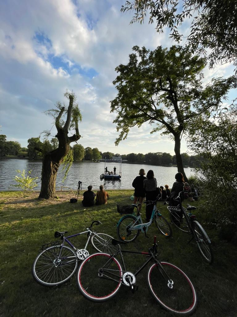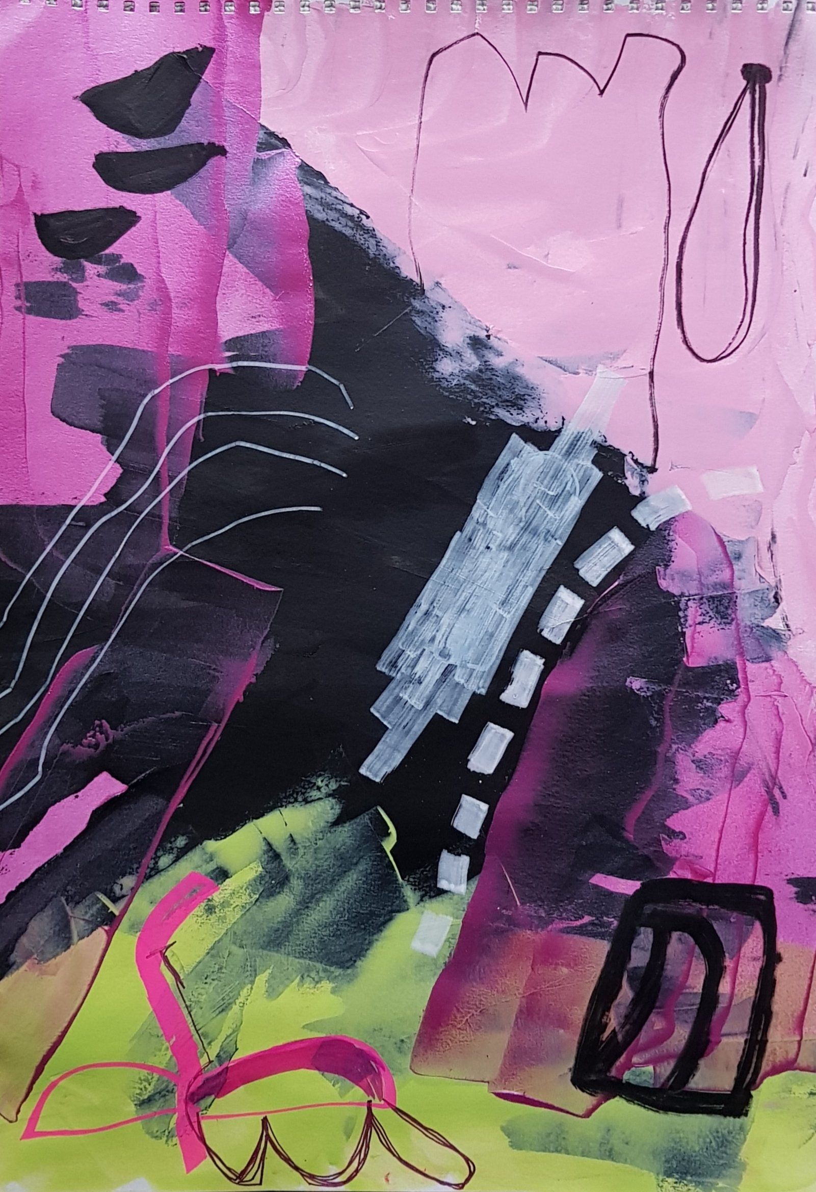 Ana Vollwesen, Weekend Trip, 2022 - A Weekend Trip is a huge Opportunity for getting new Perspectives on Life. Since Travelling is not that easy as it used to be I wanted to display a Piece around the Feeling right before a Trip. The Excitement, the Preperation, the Unknown, which is embraced by the huge black Aera. Some of the Marks might show the Road or Vehicles, different Stages of Movement and Noises. The Green represents the Landscape and the different Shades of Pink are in Alignment with the Time passing during a Trip. It all comes together in one precious Moment. The Question, that is left to the Viewer: Where you there?