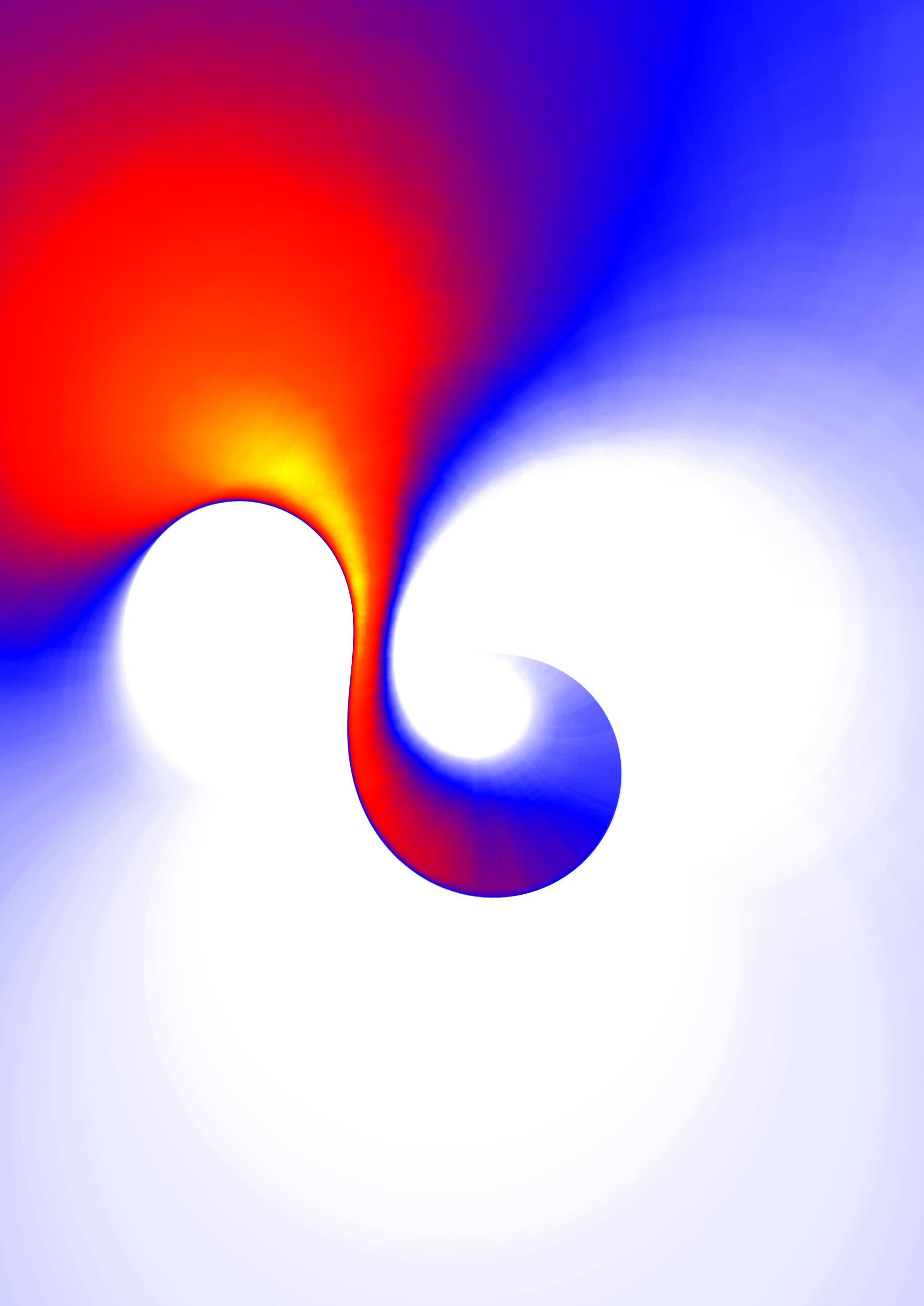 A lituus spiral under circular inversion forms the basis for this piece. One end of the spiral disappears to infinity but, under inversion, this is pulled back to zero. The longer the program is run, the closer the curl on the teardrop will come to the zero at the centre of the picture, but it will never reach it. It cannot ever reach it.