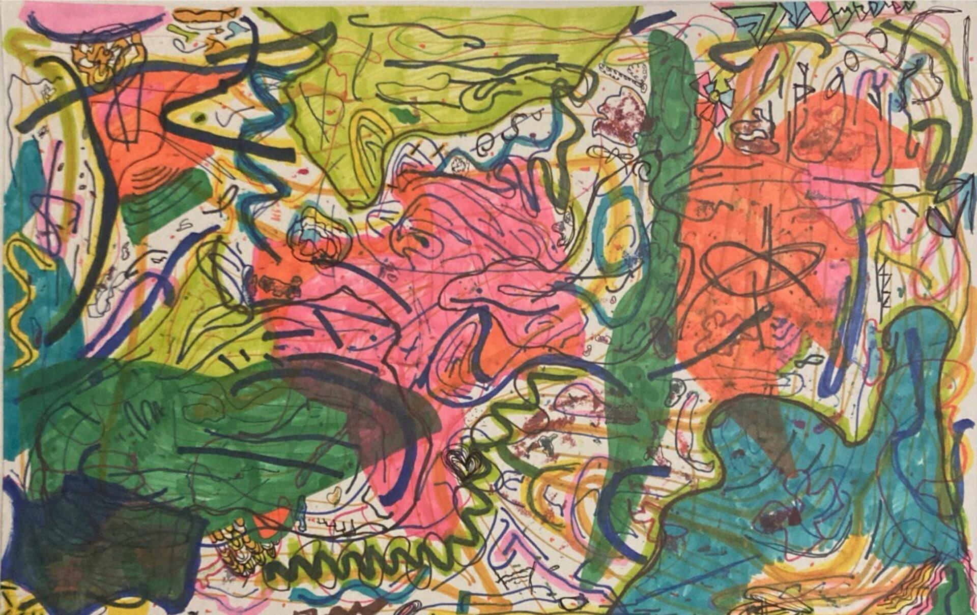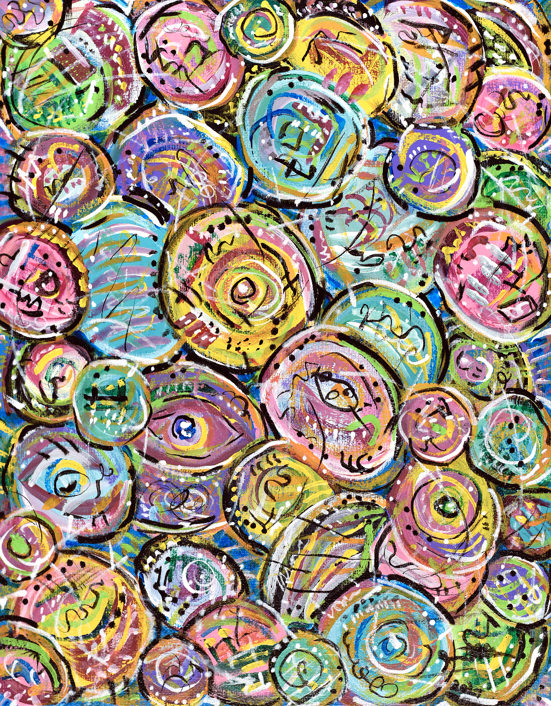 Jim Bertolacini, Eye of the Beholder - I paint abstracts almost exclusively because I love the feeling of spontaneous creativity, where I can produce something interesting and imaginative in the moment. I just allow my mood and internal thoughts to develop the imagery as I go. I use abundant color, random brushstrokes, and quirky shapes in my artwork. I named this piece after I finished it since several of the shapes look like eyes and I found the double meaning of the title amusing for a piece of abstract art. I love the layering of colorful paint and ink that produce the shapes filling the canvas.