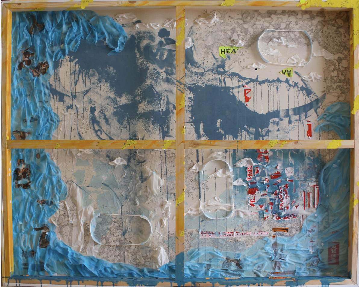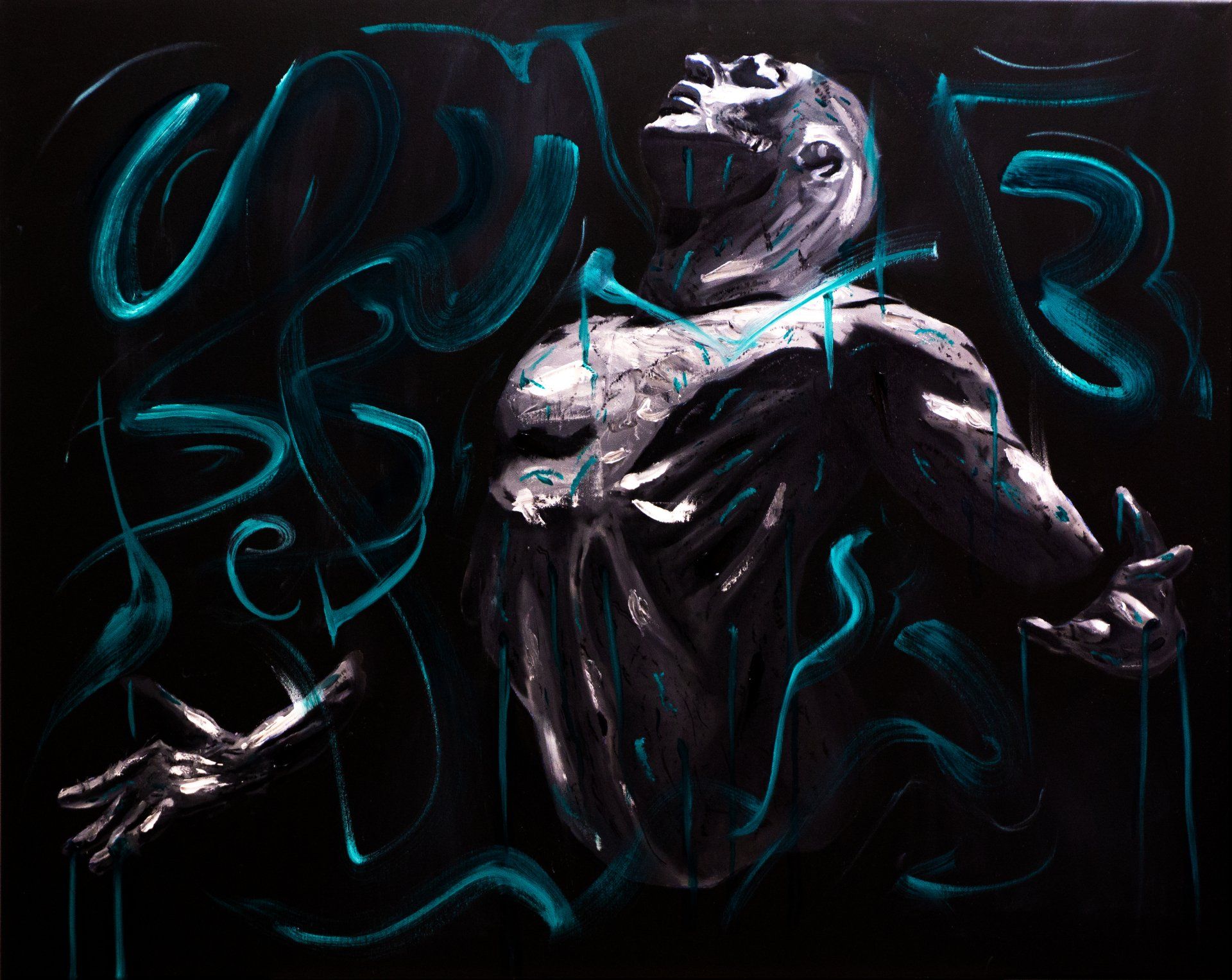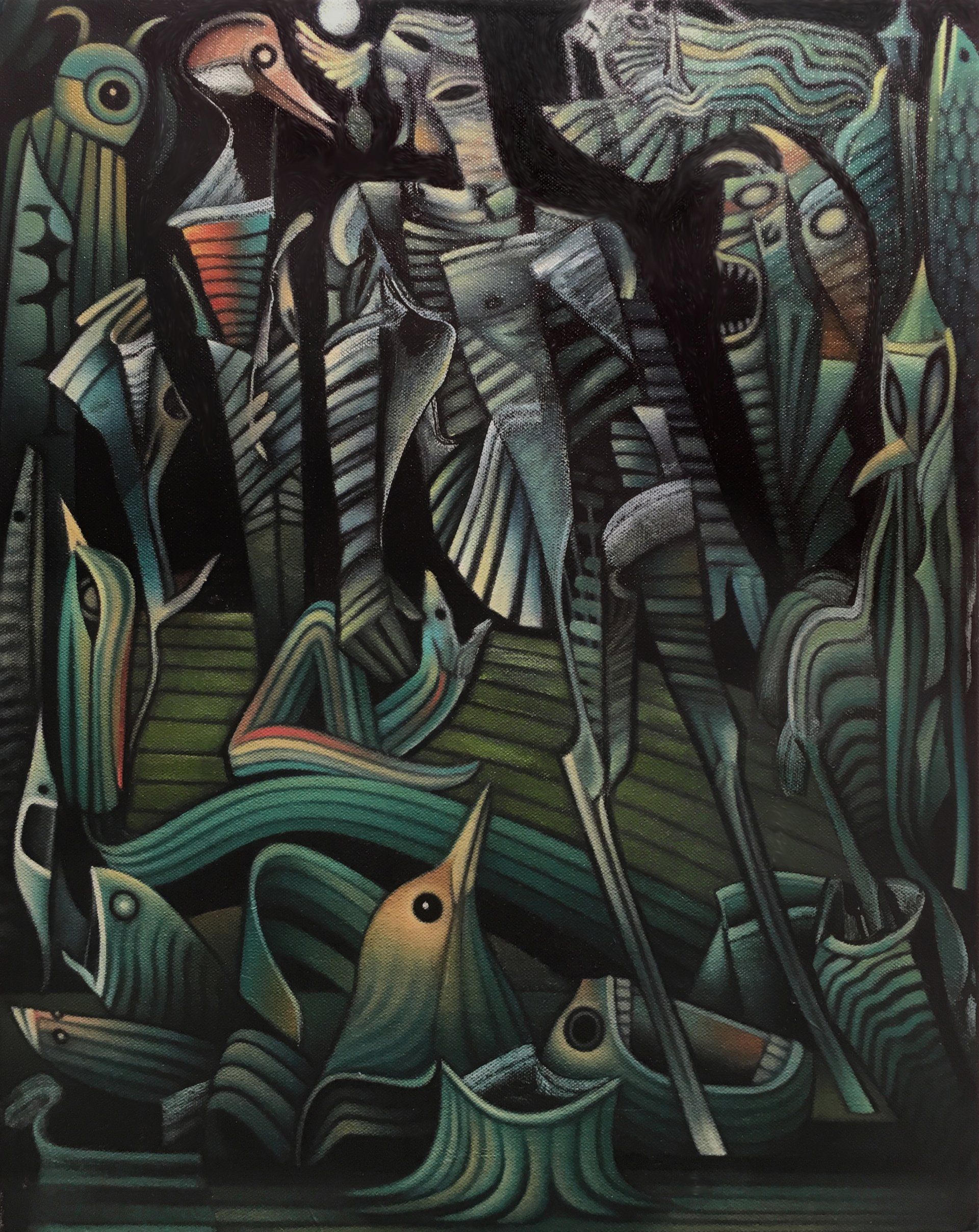 Craig Lo Presti, Faith in the Valley of Midnight - This piece was made in Brooklyn, NY in 2013. Just a year before on October 29, 2012, Hurricane Sandy slammed into the northeast coast and into New York City, creating a path of destruction rarely seen. The tidal surge flooded the Lower East Side where I was living with my wife Anna, and two year old daughter, Isla. What was worse is that we were living in a basement apartment at the time. We were displaced for six months and ultimately moved to Greenpoint, Brooklyn while the apartment was being rebuilt. I was longing to paint and find again, the strength and faith in one’s self and each other, that we often times desperately need to keep swimming up, from the abyss.