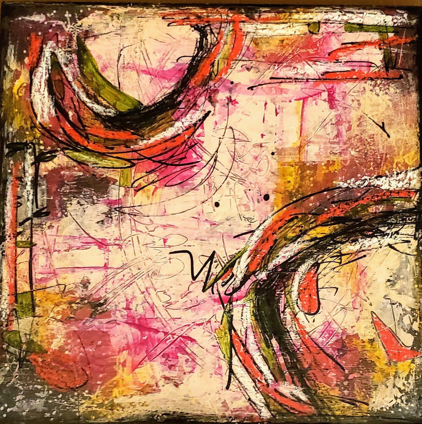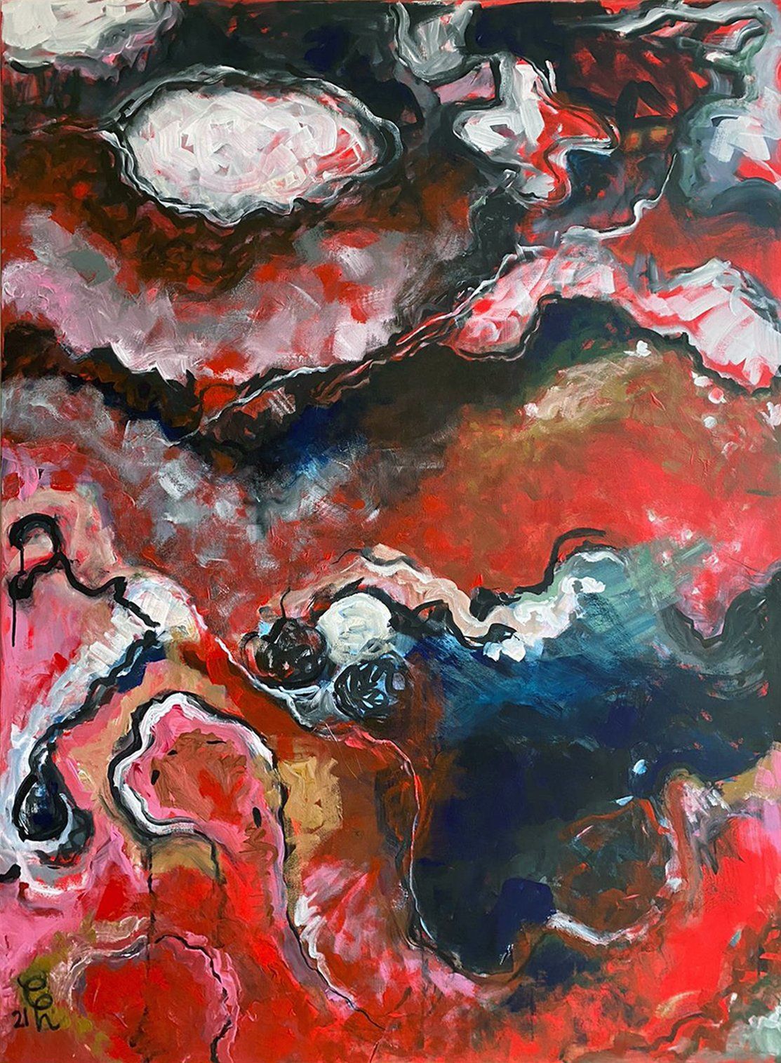 Joanne Huxford, TUMBLE - I did this work at the beginning of the covid winter. When it felt like the world was tumbling down all was falling apart. People around the world were feeling isolated frightened etc. It is a series with a raven flight of the eternal cycle of life and death. The raven brings upon the feeling of color light flight freedom from the covid world, they go well together. The thought on the color red in backdrop the fever pitch of fear uncertainty at the start of covid. The black lines at the bottom are the symbols of death and loss. The egg tumbling down gives the feeling of vulnerability the world seemed ready to crack open. I added the pink ethereal tones with the light blues for the feeling of the gods awakening to help the world out.