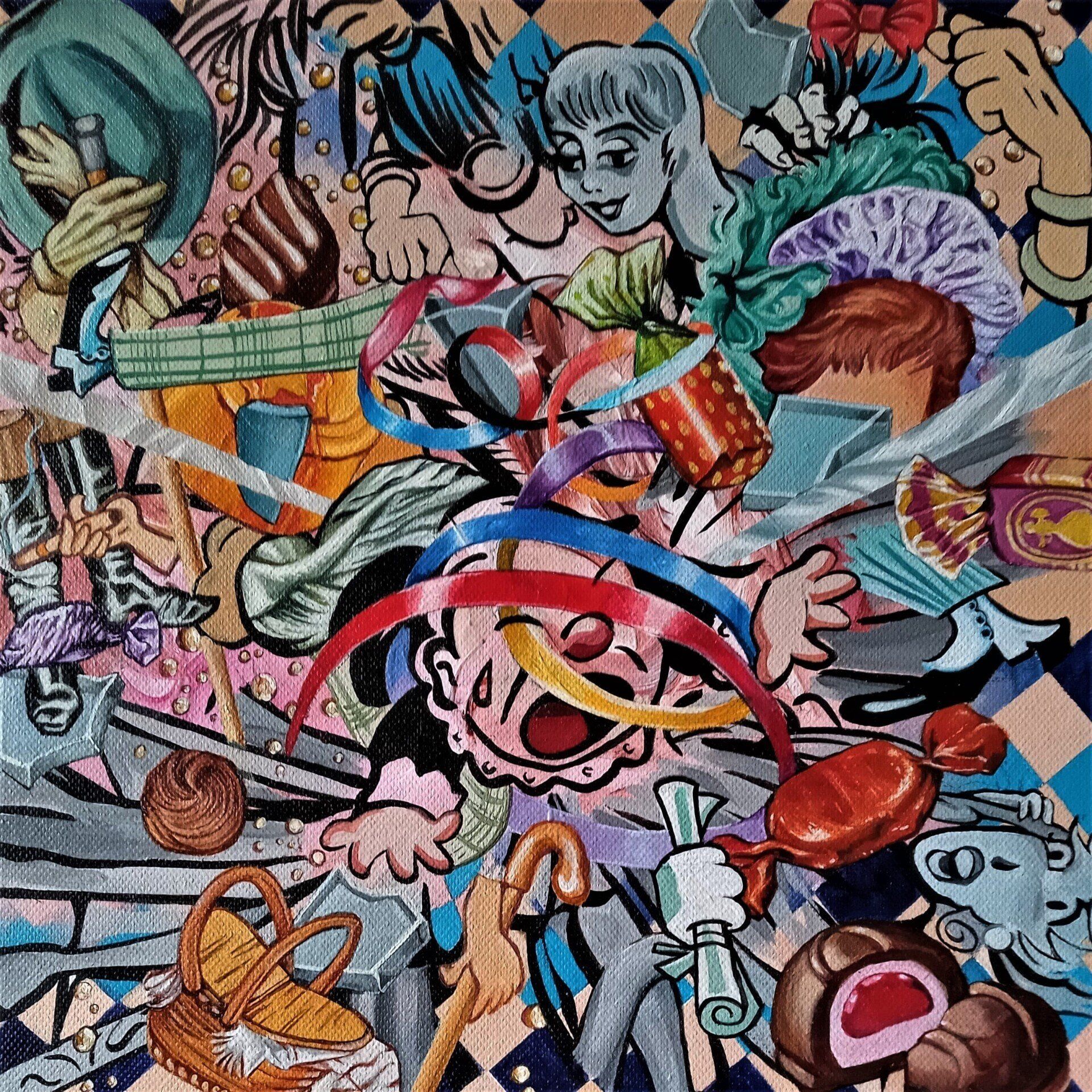 Felicita Giannikos, Contradiction, 40 x 40cm - Melancholy, sadness, disappointment and feelings of disgust towards people’s ugly ignorance contradict the happy colours of kindness and good - which you know will always be there but you sometimes struggle to feel them.