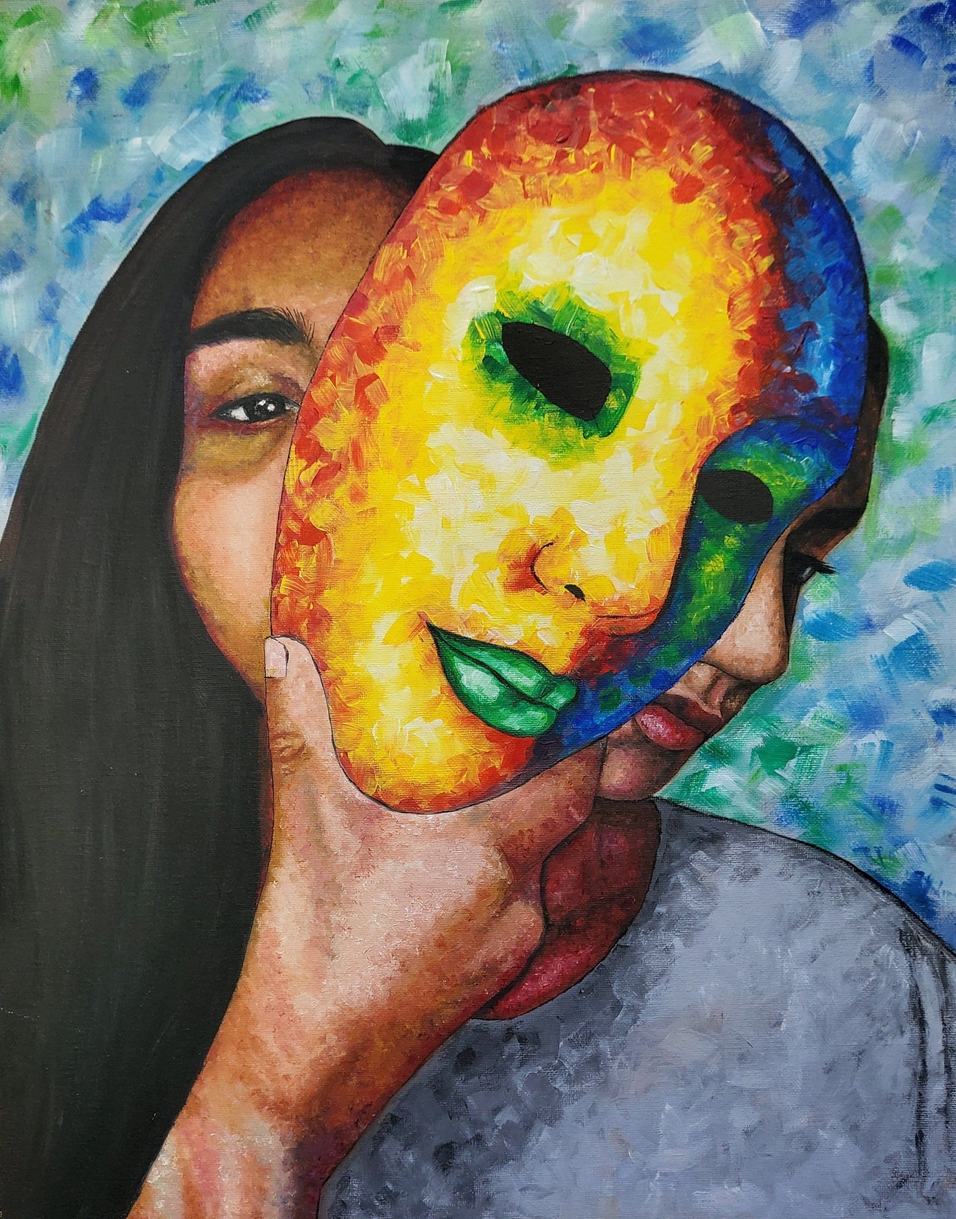 Kesar Valera, Persona - As an artist, I like to explore meaningful concepts that would resonate with the viewers. This oil painting represents the multiple personalities we carry within ourselves, as expressed by the wide colour scheme, which make up our complex identities. The mask creates an alternate reality for individuals, who may unintentionally or willingly put on the façade to hide from others. With time, becoming oblivious of this façade detaches us from our true values, opinions, culture and identity, creating psychological space separating the true nature of our soul and our observed persona.