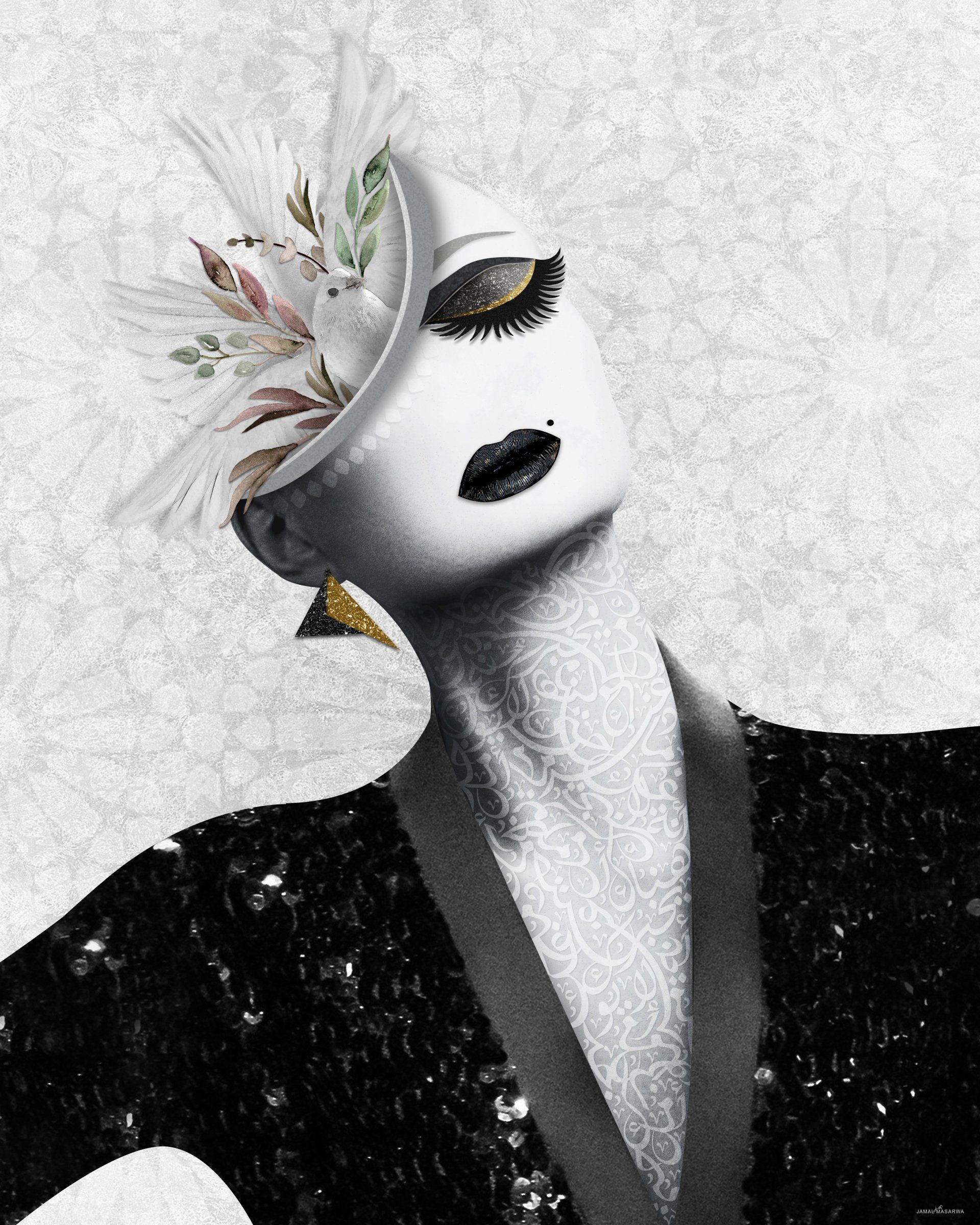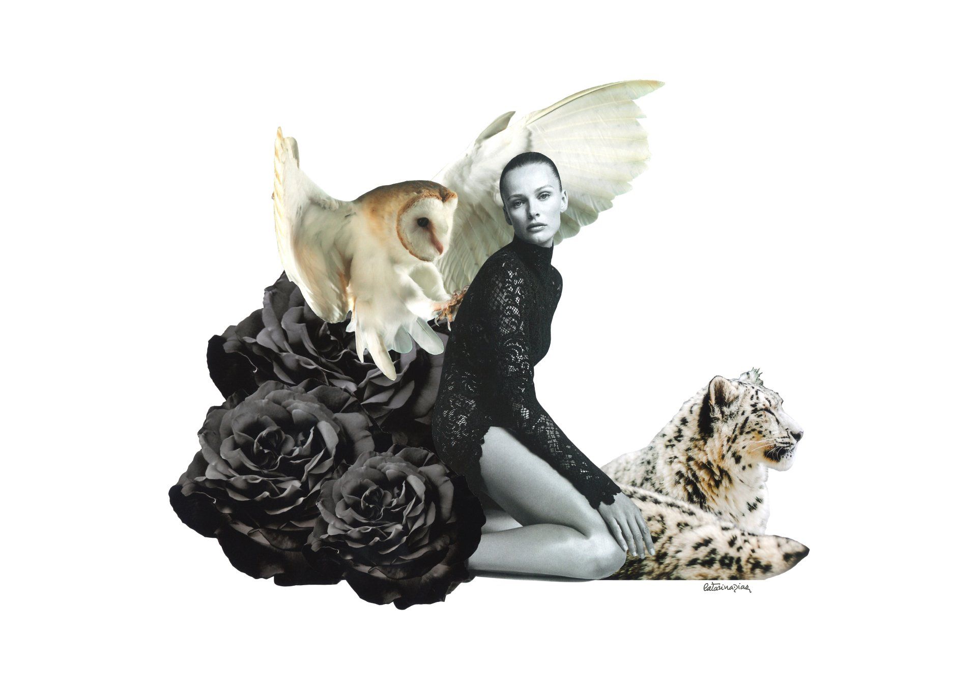 Catarina Diaz, Placidity - In the centre of the composition, a model stares at us with a distant gaze. Her posture and outfit seem staged in a photoshoot. Still, the energetic body of this figure shows a mixture of tiredness and alienation, the first denounced by the arched back and the second visible in the look and facial inexpressiveness. Three black camellias are blooming on the left side of the composition, adding weight to the atmosphere. But the white owl, which appears in the foreground, perching on this woman’s back while protecting her with a vast white wing, brings us a message to retain: we must notice what is not visible to us and others. And that peace prevails.