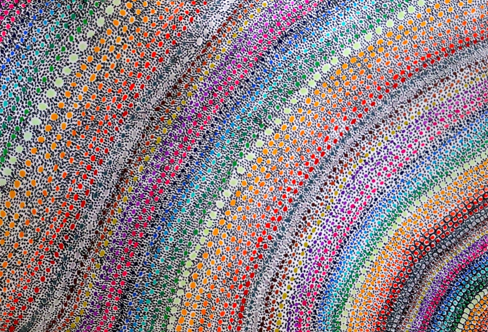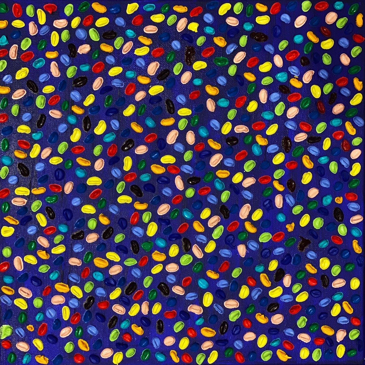 Tara Dinic, Skittles III - Inspired by her travels, in particular to South America, Tara Dinic works with acrylics to create vibrant, textured colours. The colours and dots used in the artwork depict raindrops and the emotions they bring. For areas of the Earth where it seldom rains, rain can bring happiness, food and colour. This artwork is part of a playful series ”Dots”, a combination of the physical form of rain with the feeling and effect it brings once hitting the Earth’s surface. A visually fulfilling exercise for the eyes and soul.