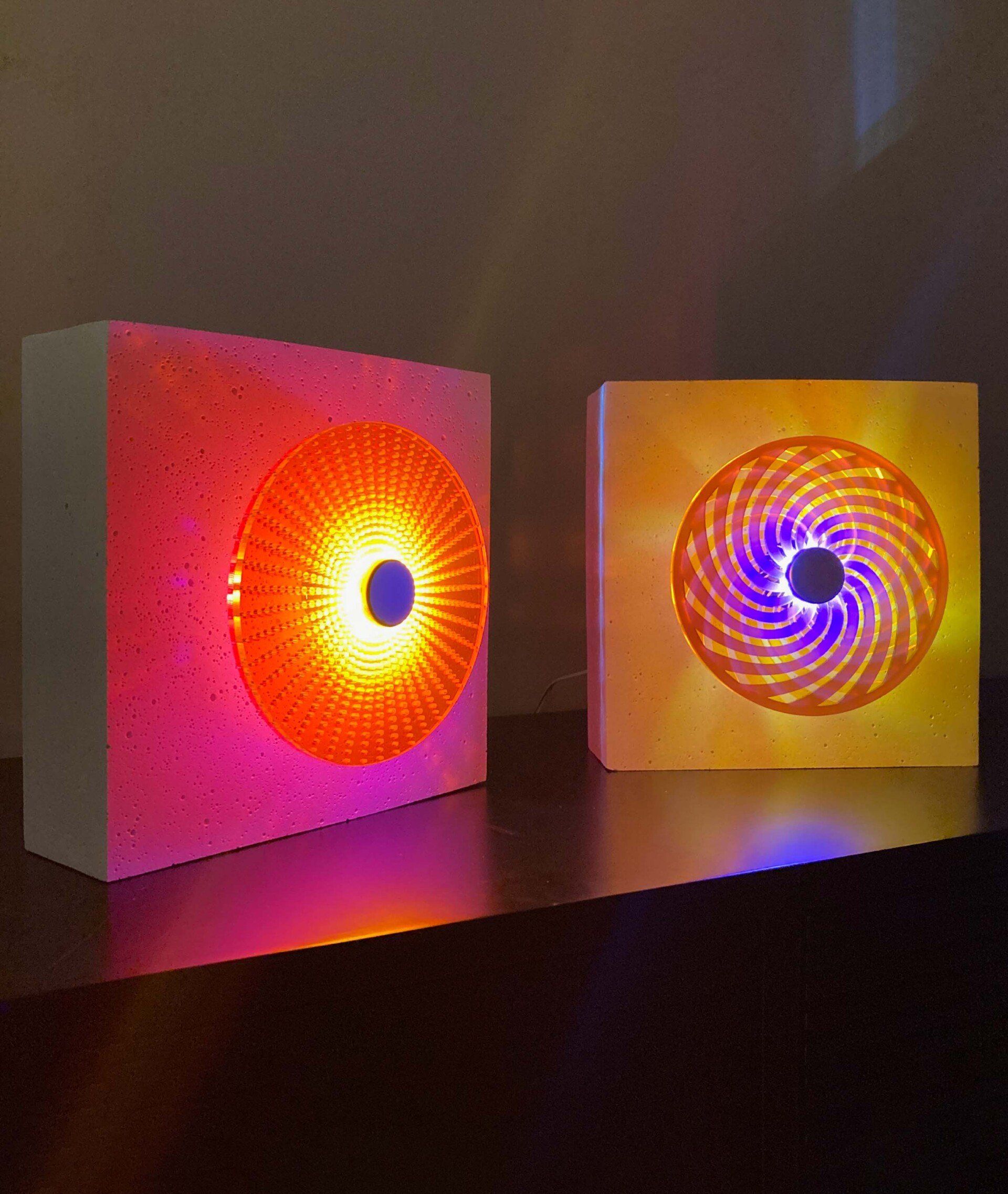 Luiza Milewicz , MOIRÉ MANDALAS - These works evolved from an investigation of the circle as a sacred geometrical shape with association to the mandala, symbolising the idea that life is never-ending and connected. Specifically, the patterns within each circle correspond with the spiral and starburst symbols, with the former used throughout time to represent evolution of spirit and consciousness, and the latter being associated with the sun to represent life, energy, and guidance. More personally, these mandalas are associated with meditative healing, representing a current state of feelings and emotions. Their interactive nature comprises two illuminated spinning acrylic discs set in motion to reveal a subtle moiré effect.