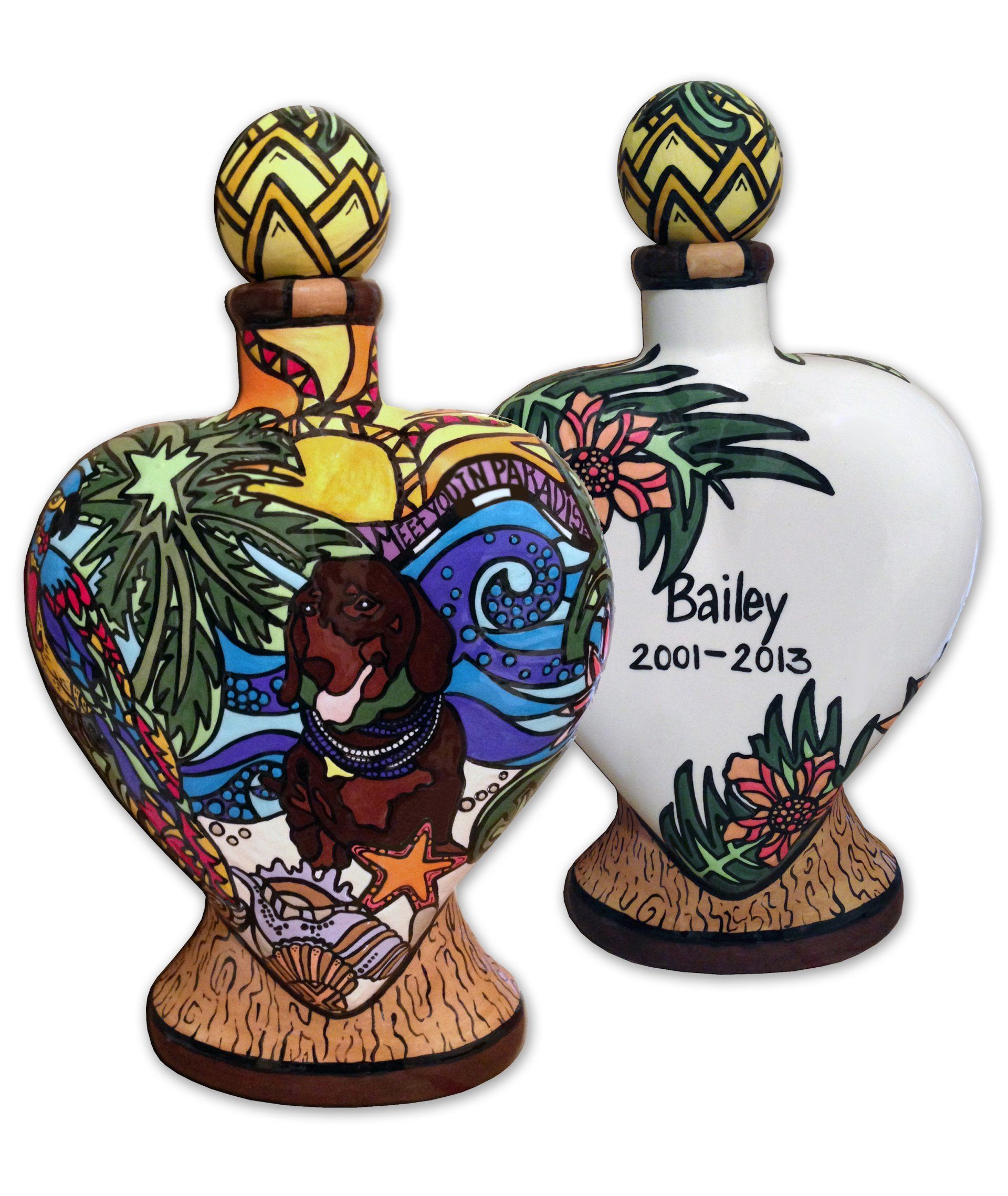 Alyson Whitney, Bailey the Dachshund’s Custom Dog Urn - Inspiration for Bailey’s Custom Dog Urn: Bailey was a Dachshund and a Parrot Head – that is, a huge Jimmy Buffet fan. He’d been to 43 Jimmy Buffett concerts! He traveled everywhere with JP, the man who couldn’t bear to eat in a restaurant without his friend by his side. When JP left this earth, Bailey moved on to comfort his wonderful sister, where together they were able to find the ability to love again. Bailey has rejoined JP, helping him watch over the woman they both adore.