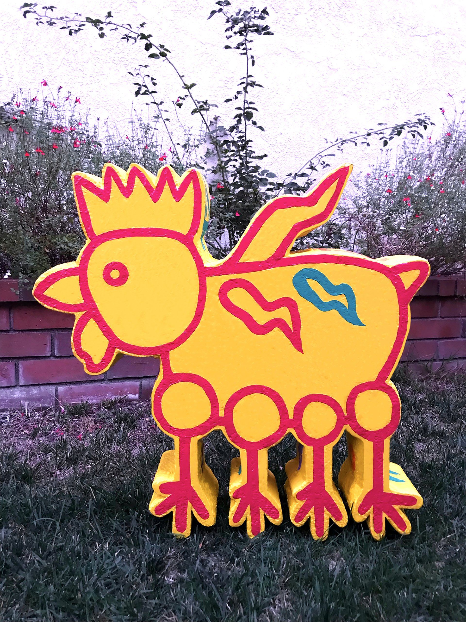 Feiran Wang, Mutated Chicken Yellow - Mutated Chicken Yellow is a mixed-media contemporary sculpture (32X34X6Inches) made of resin, foam and acrylic. The form of the sculpture was inspired by the artist’s own experience of once having a close encounter with one of those godly creatures in her early childhood, in a remote suburban home of Wang’s grandparents in China. The mutated chicken with an underdeveloped third foot, was destined to become the ontological precursor of Wang’s artistic essence and later the centerpiece of her artistic opus.