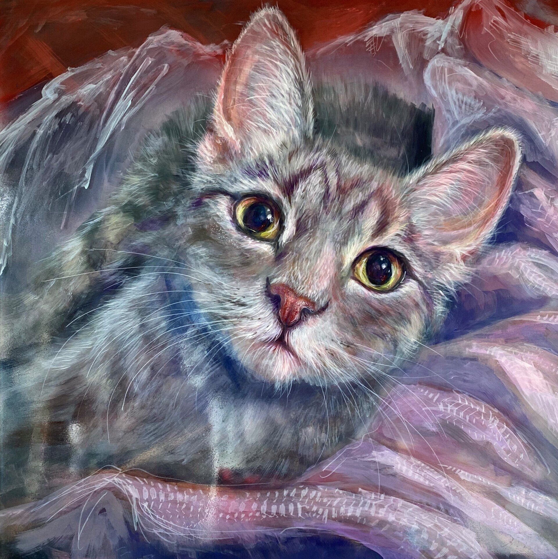 Erika Chapman, Merrigold - To me, a portrait should be almost awkwardly intimate...a moment that isn’t for you but you’re here now so all you can do is bear witness. With Merrigold, I feel I’ve been successful in this. Her expression is bold and interrogative. Somewhere between “Are you here to pet me?” and “You are here to pet me,” yet by contrast she is gentle, comfortable in her blankets and inviting. This is concept is echoed through my use of both the front and reverse sides of the plexiglass to create a 3D effect in its physical depth, inviting the viewer in for a closer encounter.
