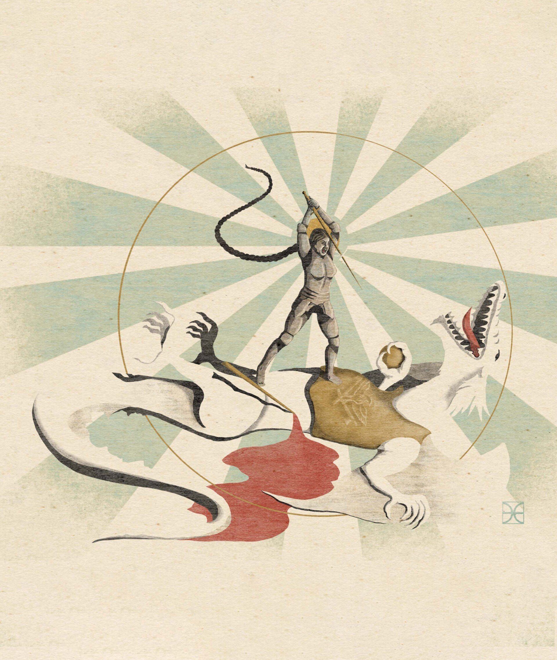 Charlotte Condie, Georgiana and the White Beast - Georgiana and the White Beast is a feminine perspective of the St. George story. But it also represents the triumph over global empires that continue to do harm on the world. Georgiana is exacting the final blow on the white dragon dressed in imperial armor and clutching the sphere of global influence. Women, especially women of color, are the ones necessary to deal the final blow to white supremacy, patriarchy, and capitalism that continues to do harm to the global family.