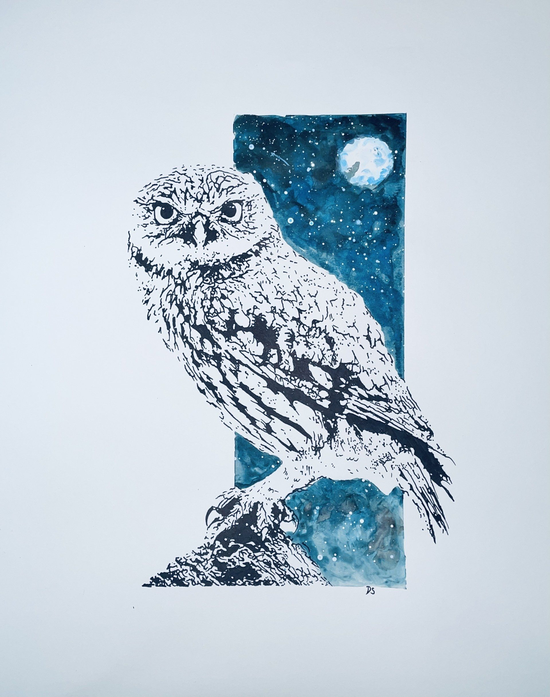 This piece is of an owl drawn in Sharpie Fineliner giving a bold detailed outline and using a mix of blue inks creating a striking contrasting background.