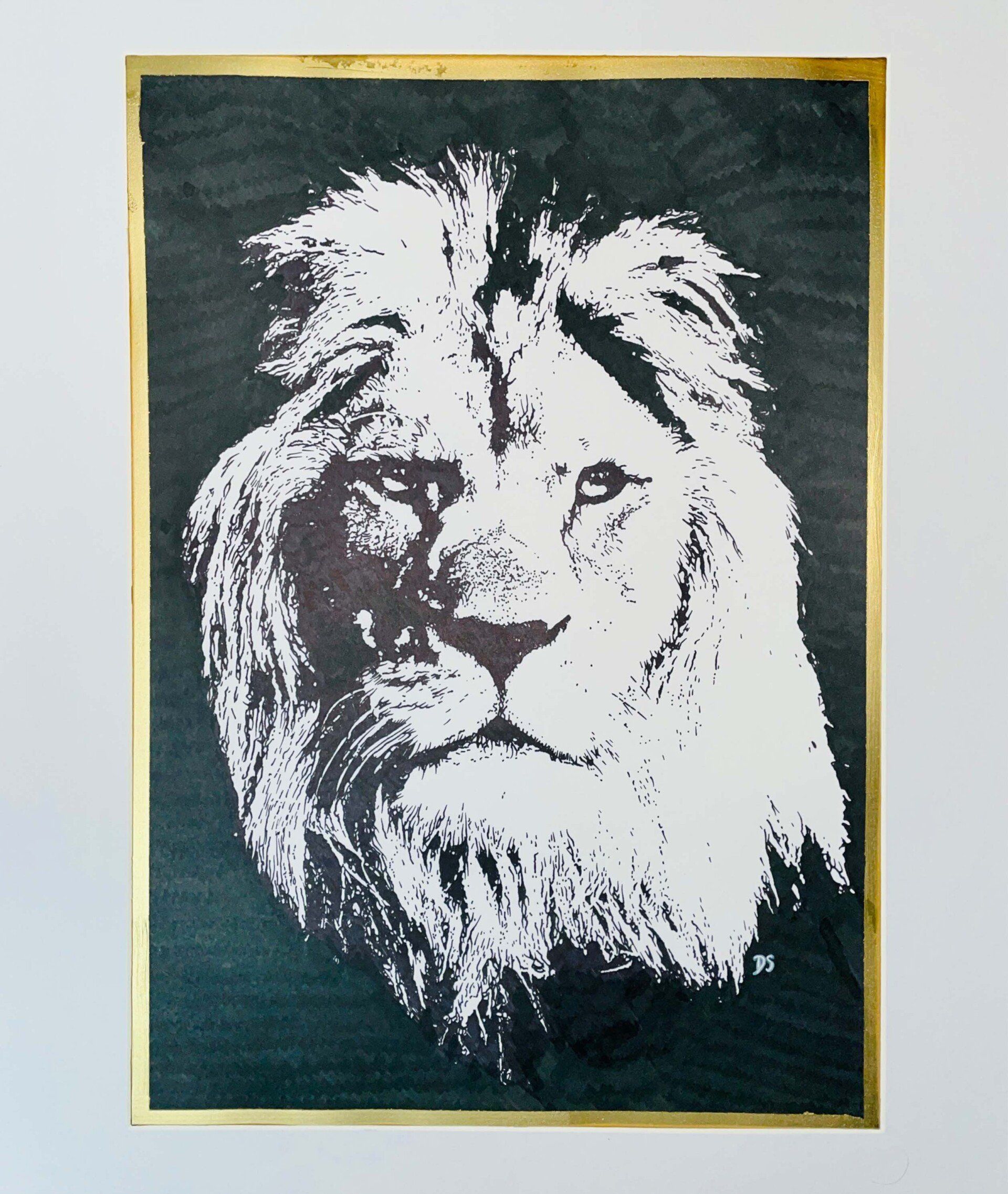 Daniel Screen, Roar. Medium: Sharpie fineliner and marker on smooth Bristol paper, with mount and liquid gold leaf embellishment, 50 x 40cm framed - I am passionate about nature and landscapes. I enjoy using gold embellishments to bring out the boldness of the line in pen. This lion was my most detailed illustration to date using fineliner and markers to fill in the lion head and background.