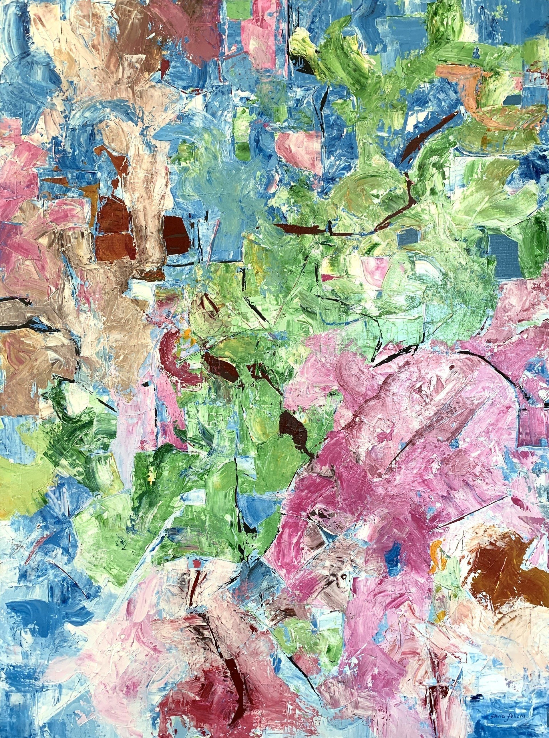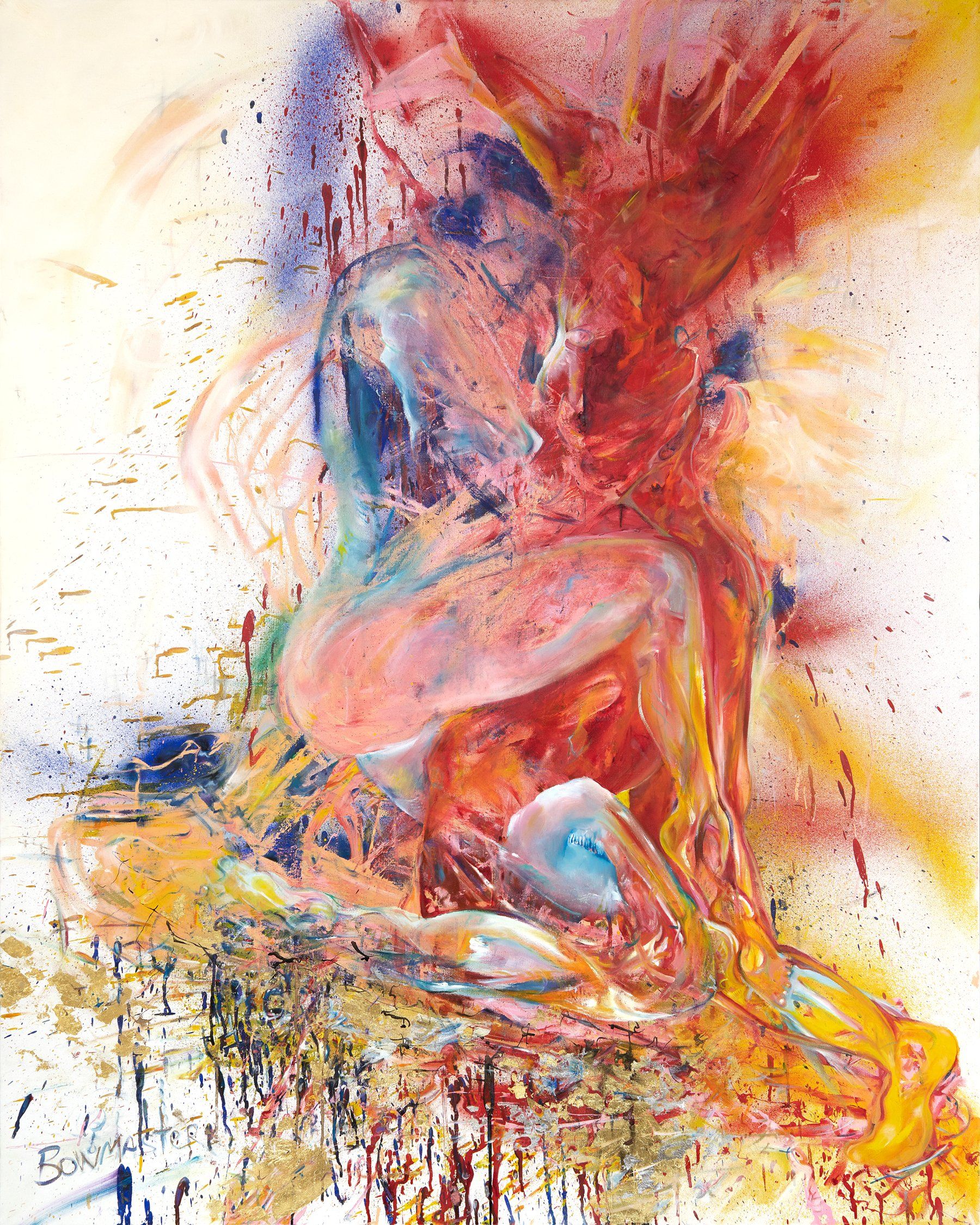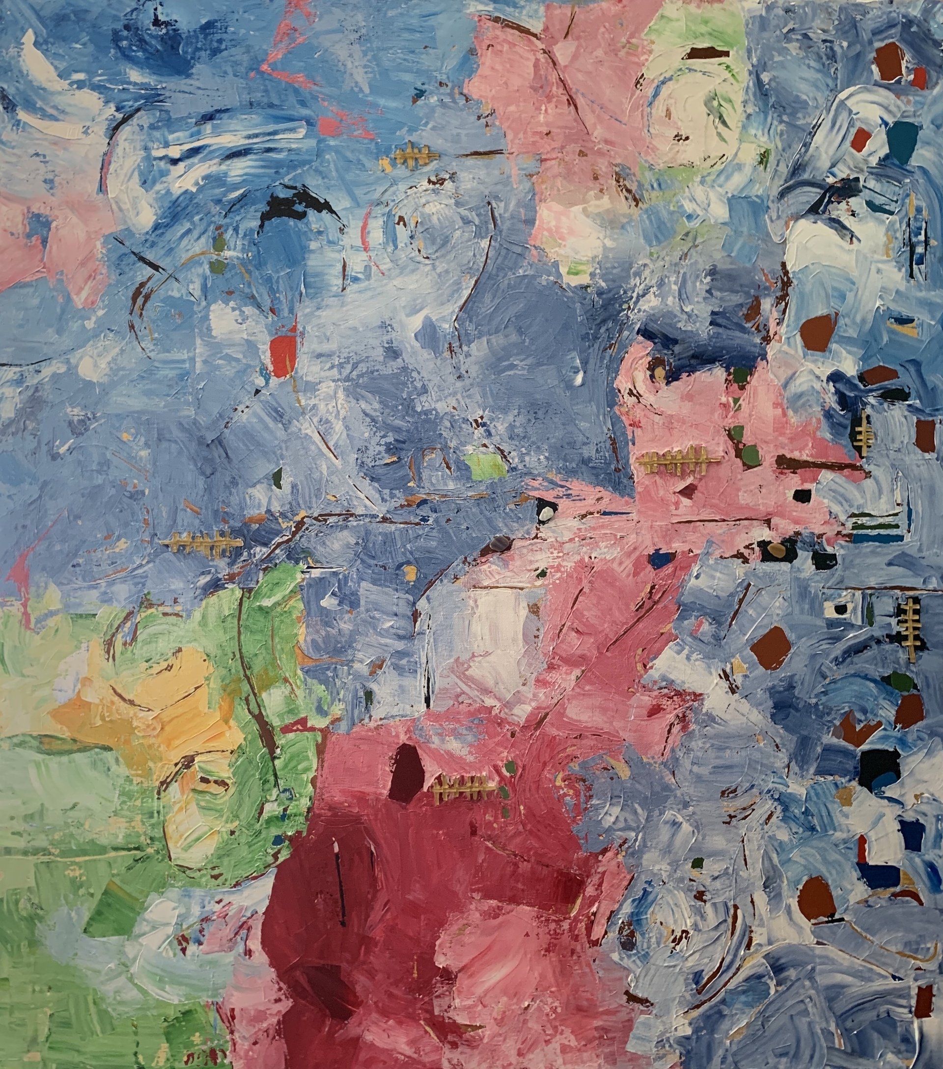 Kris Bowmaster, Ecstacies of Commitment - This painting was created in the middle of the pandemic without any audience in mind, with supplies low, and my income halted. I brought out broken spray can bottles and used a nail to gush the lush colors onto the large canvas. From there I applied thick beautiful smears of pink with a pallet knife inherited from a loved one who recently passed. This initial approach was fast action painting. From there I cared for and nurtured the surface for months, simultaneously bringing form to the painting while retaining the drama of its conception.