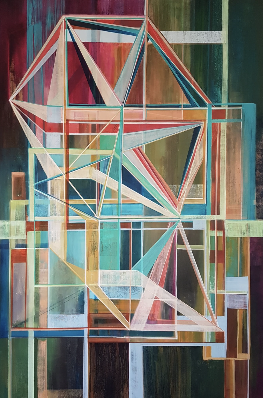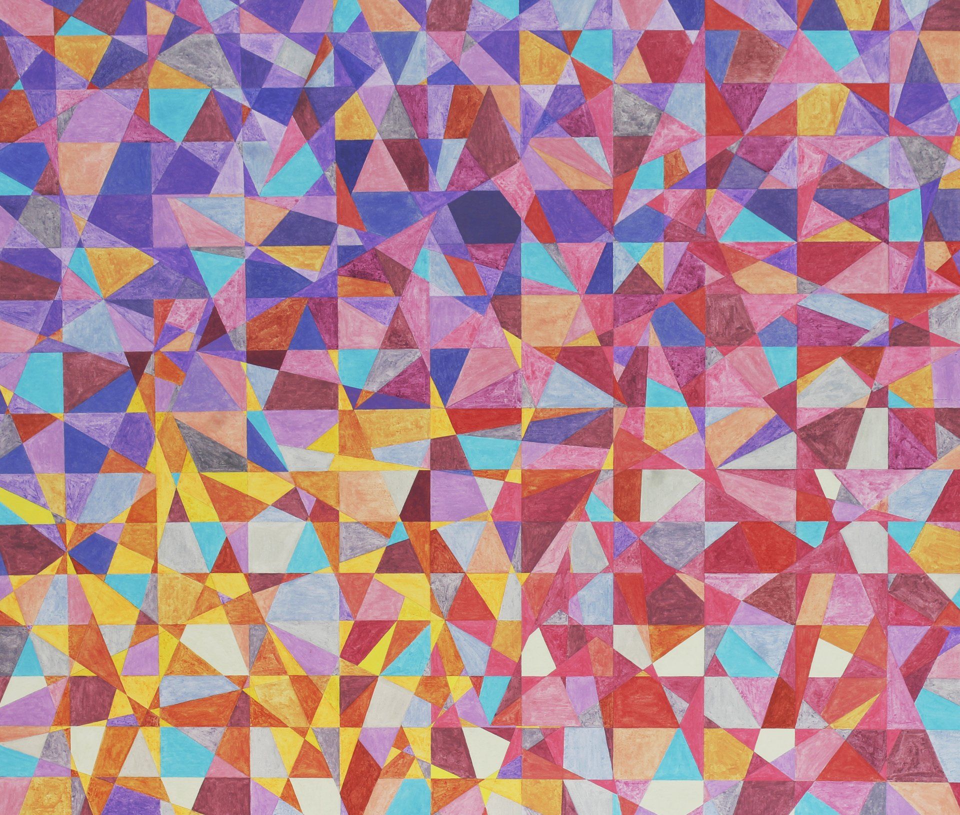 Alan Lacke Cairo, Insta (160x140cm/63x55”)). 2018. Precio 11.200€/9400 libras/12700$ - It is a work that alludes to the social network Instagram. Where there is a wide-ranging international cultural encounter with the visual arts through its platform. With colored waterings I represent multiple geometric shapes that make up an abstract and complex image on the canvas. An infinite network of connections that represents my vision of the Instagram platform.