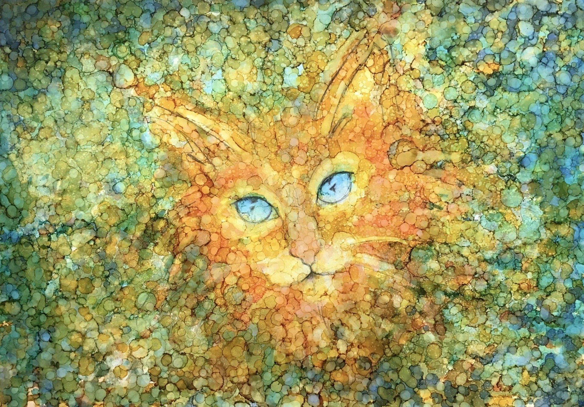 I am painting on various surface (canvas, gessobord, Claybord and also on recycled porcelain and ceramics plate, sculpture etc.) Among other painting media, I also use Yupo, the 100% recycled synthetic paper. Then I reproduce it and enlarge on big canvas Tizian 100cm x 150cm x 4cm. In a cat’s eye, all things belong to cats...