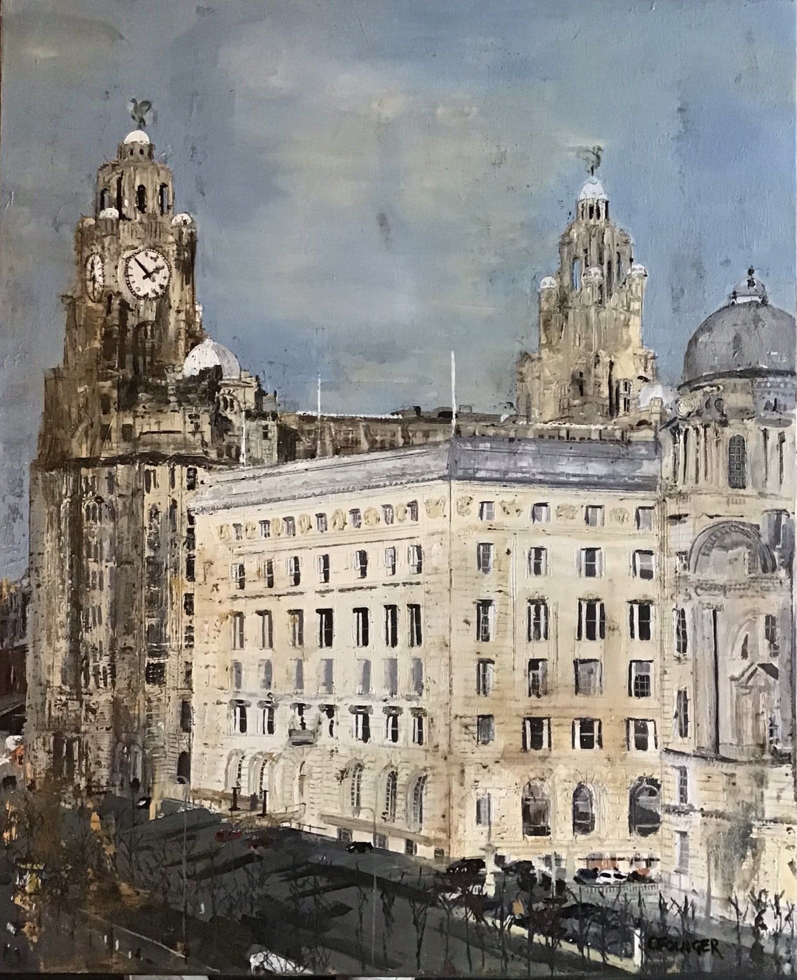 Carol Foulger, The Three Graces - My painting “The Three Graces” is my tribute to the city of Liverpool’s maritime heritage. Liverpool has for me, one of the most stunning skylines in the world and the Three Graces are situated majestically on Liverpool’s Pier Head. They are a visual testament to the wealth and prestige of the city. The Three Graces truly are charm, beauty and creativity personified and with the two Liver Birds Bella and Bertie standing proudly, what’s not to love and admire?!