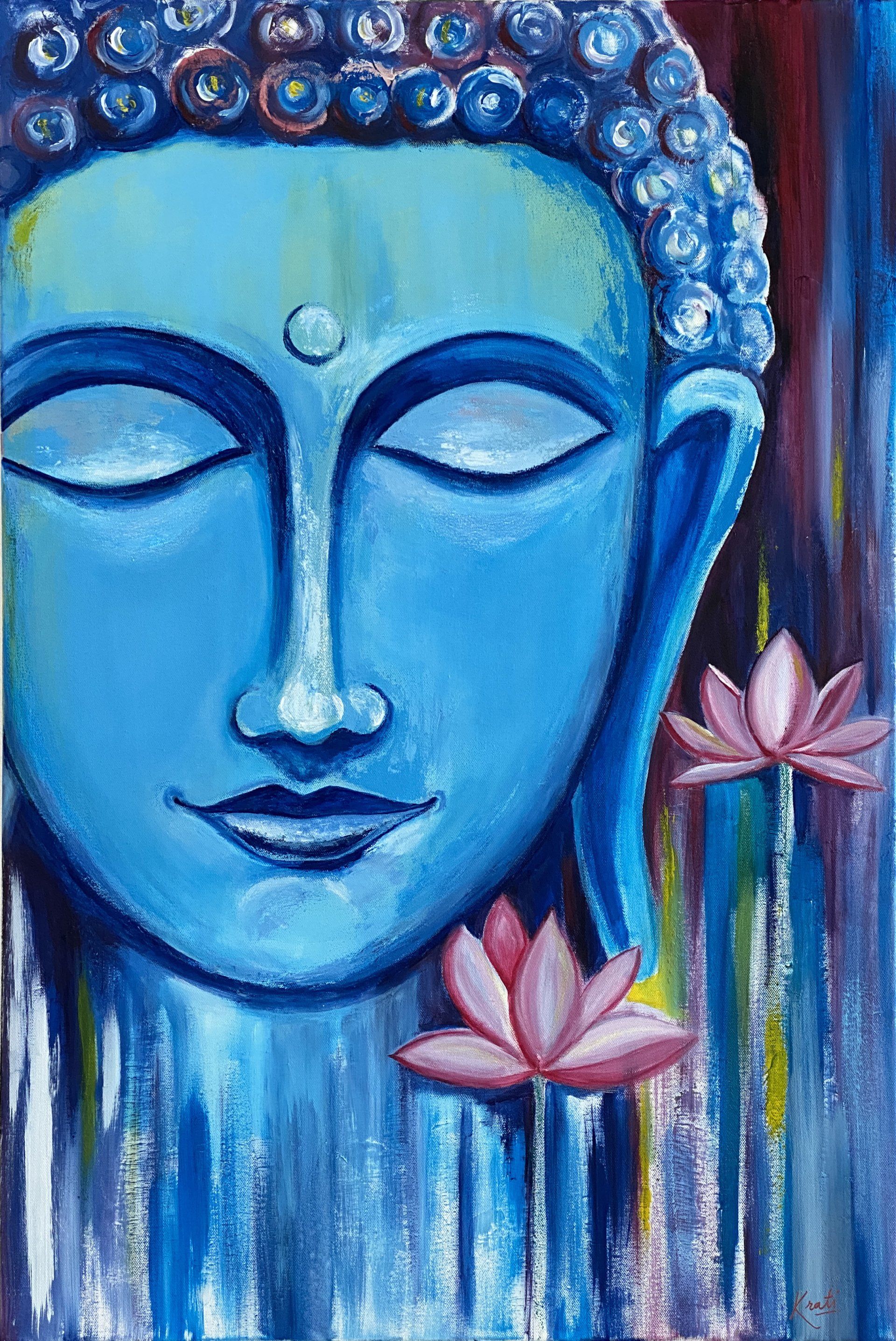 Krati Jasoria, Serene Buddha - Artwork Description: Aura of tranquility and perfect peace of mind is captured in the blue coloured portrait of a Buddha in deep meditation. The deep colored abstract background in hues of red and blue signifies the flow of positive energy. It is complimented with a pair of lotus flowers, symbol of purity, enlightenment, self-regeneration and rebirth.