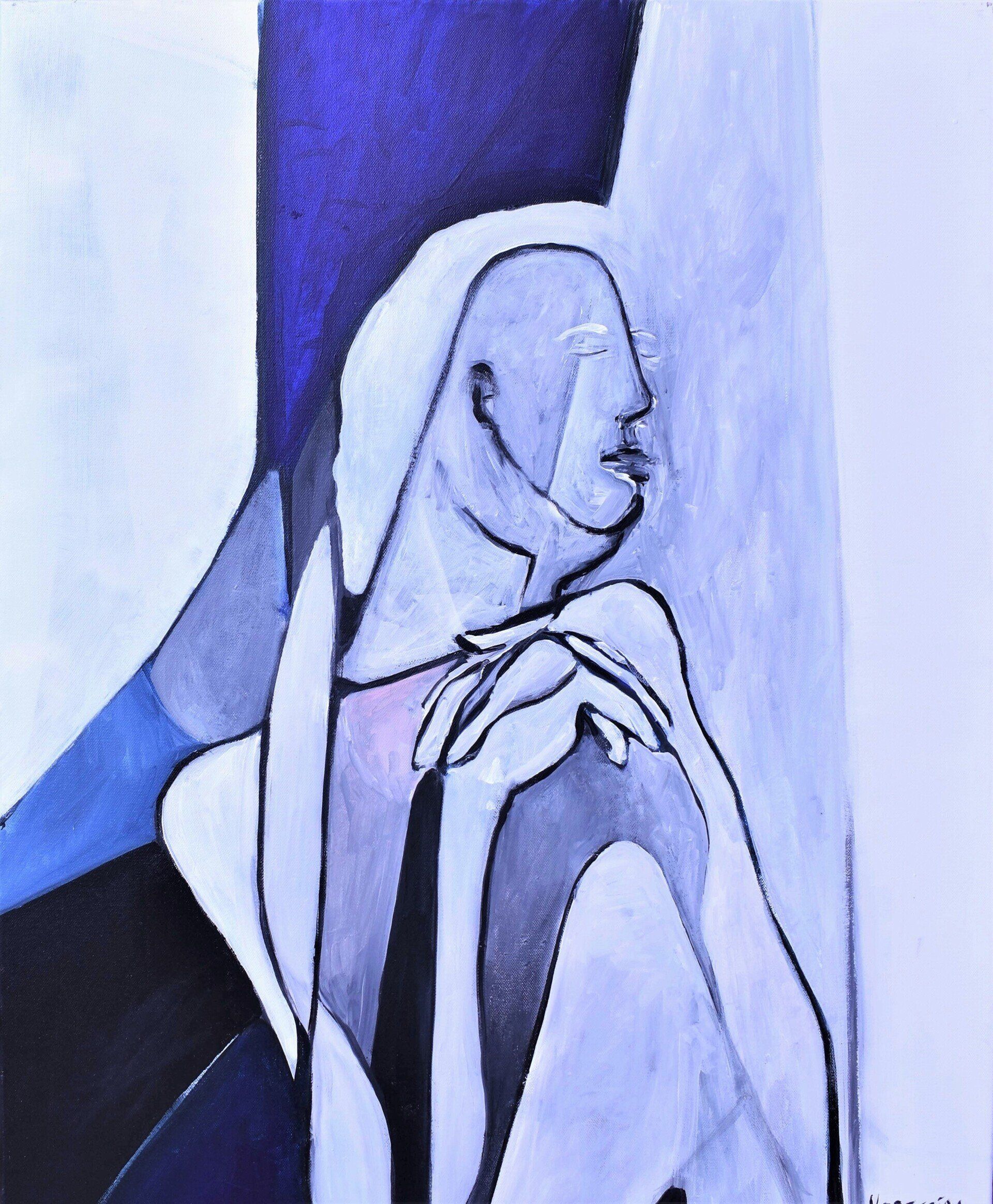 Maria Penn, Sadness - My work portraits exposed human forms, that strikingly permeate the painting. Their role is cardinal. Those imageries tell their personal stories, always vulnerable and tense in their daily social life. In my paintings, I depict the modern human in a permanent clash with societal rules, while accepting behavioral reconciliation and living by social norms. I am inspired by the contrast and opposition of colors, so comparable to human relationships, their deep connections, and interpersonal conflicts. I am impressed by our only so sincere and unique reaction to each of us, pursuing social distancing and provocative demonstrations.