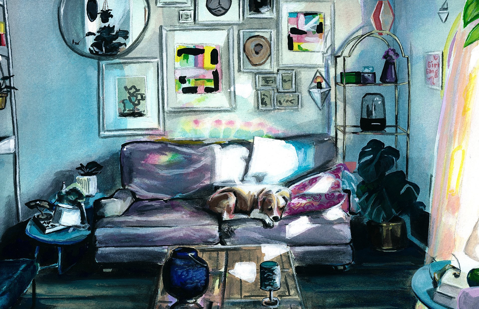 Alyssa Doggett, Gratitude - My customer hired me to paint this for his friend who put a lot of work into making her living room one of her favorite places. I could tell from the reference photo that she appreciates color so I didn’t hold back accentuating the luminance and vibrance. I underpainted the shadows with watercolors and completed the painting with gouache.