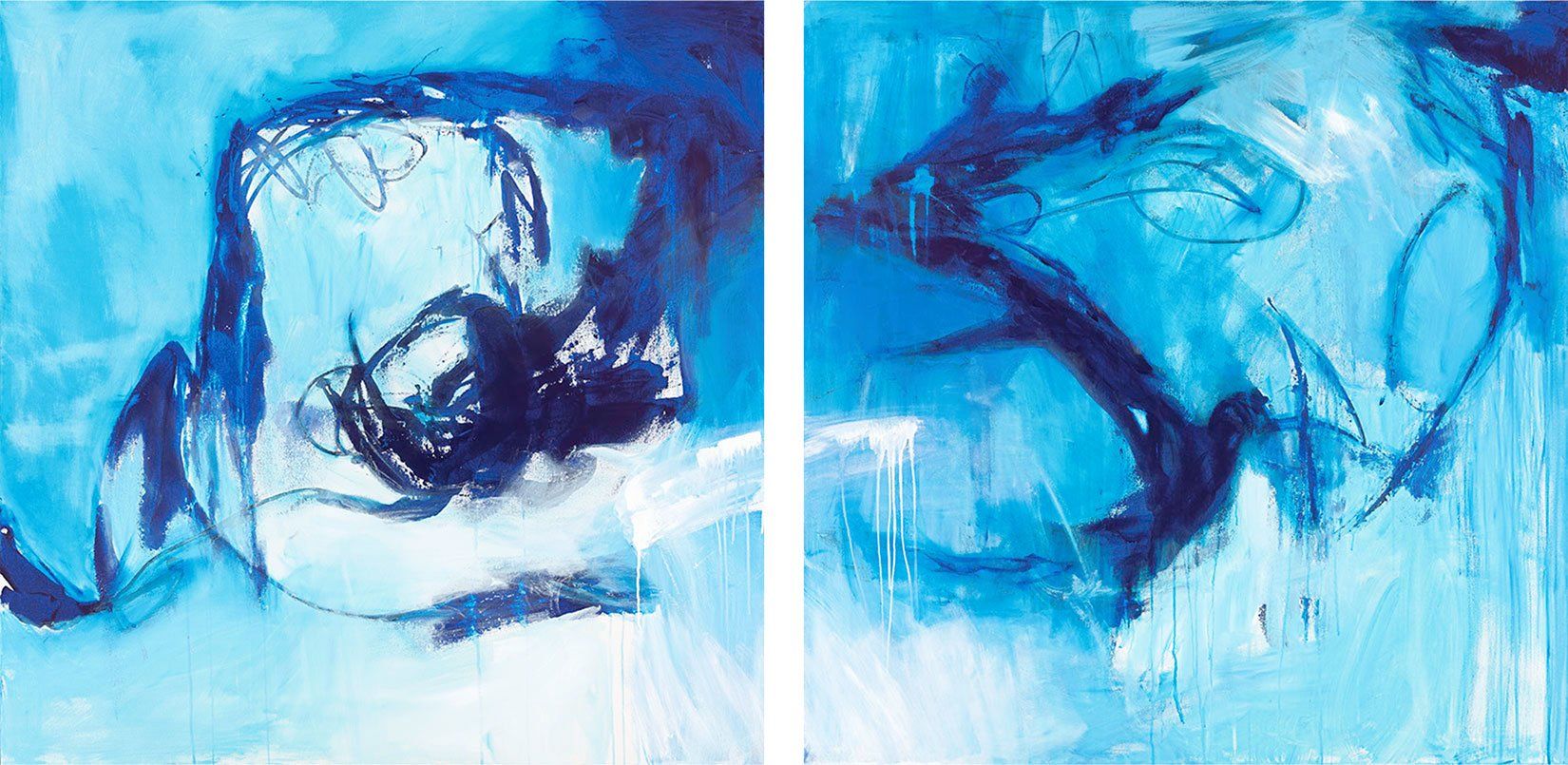This diptych captures that moment of euphoria, when the human spirit soars beyond ordinary limitations, exceeding the physical in the modern world. Drawn directly from the tube of paint on canvas, this metaphorical work uses gestural drawing to articulate nuances of the human condition, while entwining the connectivity of man and nature. The visceral application of the painted drawing, the drips, smudges and quiet moments among the chaos, parallels the pain, struggle and finally, the exhilaration of this momentous journey.