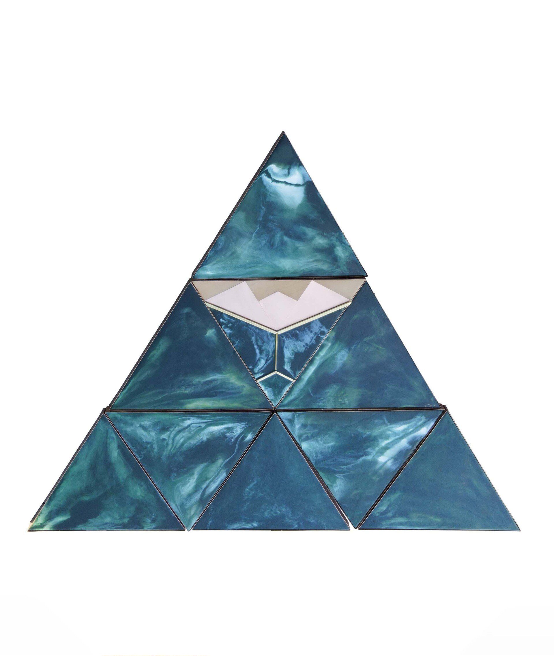 Luiza Milewicz , PEAKS AND VALLEYS - Peaks and Valleys lamp utilises styrofoam by-product placed in a linear configured pattern and illuminated from behind a translucent perspex sheet. It is at once sculptural and functional and belongs at the nexus between art and product design. It is part of a body of work that engages in an ongoing exploration of light, form and pattern, using shapes, colours, and compositions to evoke biological, botanical, geological, architectural and mechanical structures. In this work, the triangular step-like formation brings to mind an aerial photograph of snow topped mountains, or a rocky cascading waterfall, or perhaps a modern architectural building facade, referencing the visible regularities of form found in nature and culture.
